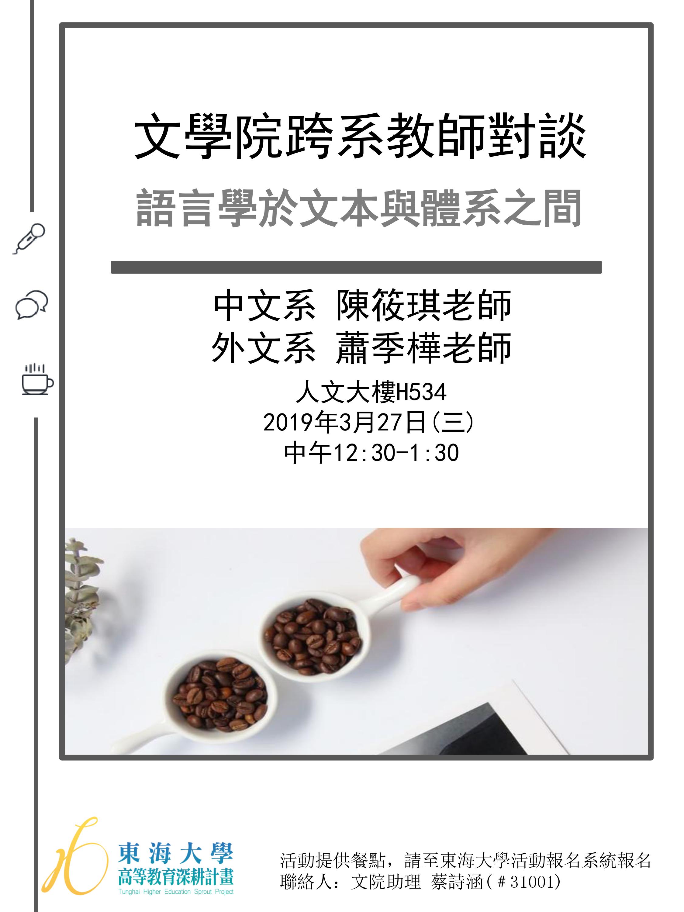 文學院跨系教師對談系列--語言學於文本與體系之間 加入Google行事曆 | 人文大樓H524 | 2019-03-27 ~ 2019-03-27 | 12:30 ~ 13:30 | 1 | 50 | 42 |