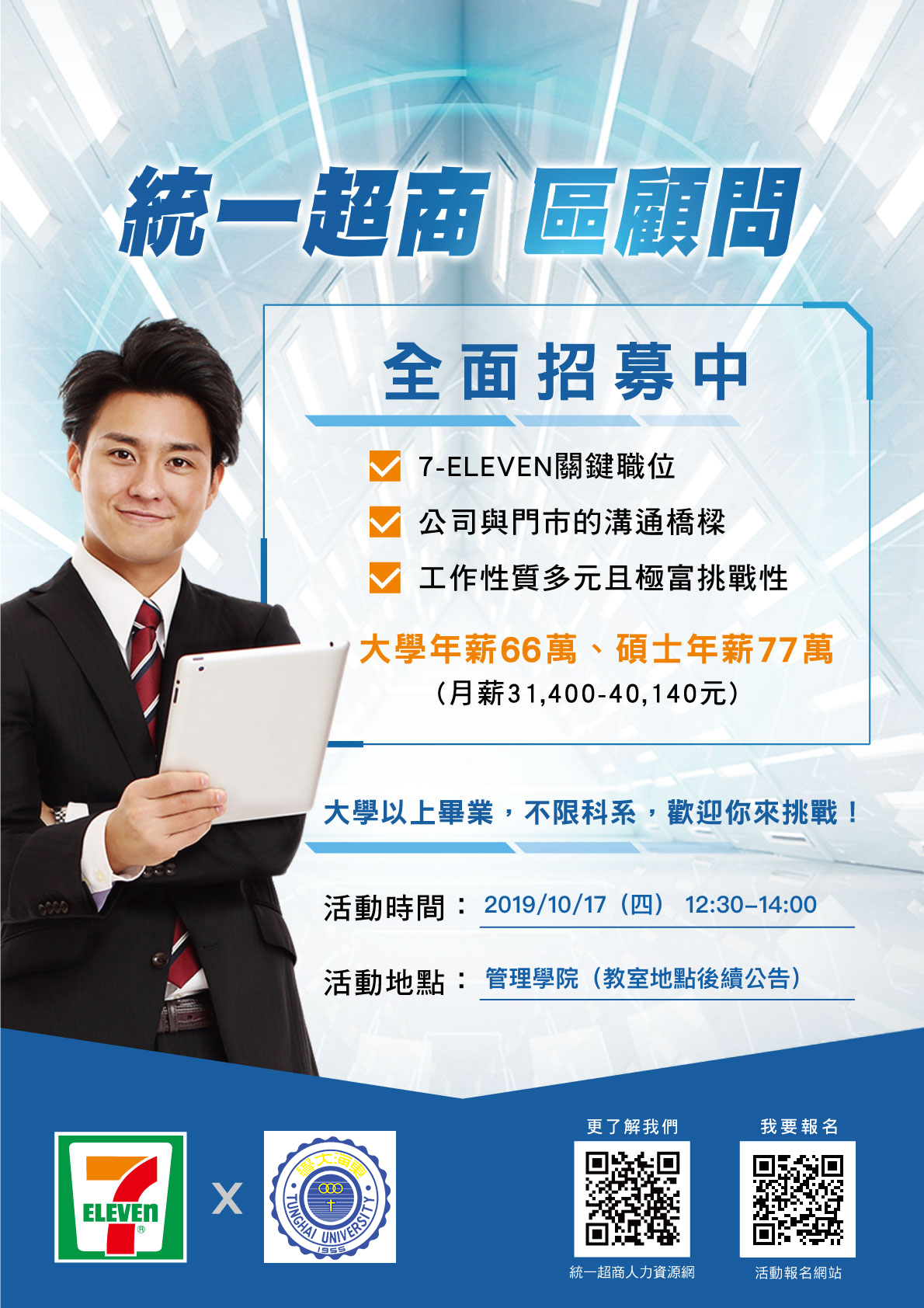 *活動內容: 統一超商股份有限公司將進行零售業之趨勢說明,以及公司人才招募需求,內容包含:正式職缺與實習計畫說明,歡迎大三大四的同學不限科系,只要您想了解零售業或想參與實習計畫,都歡迎一起參加本次分享會喔!