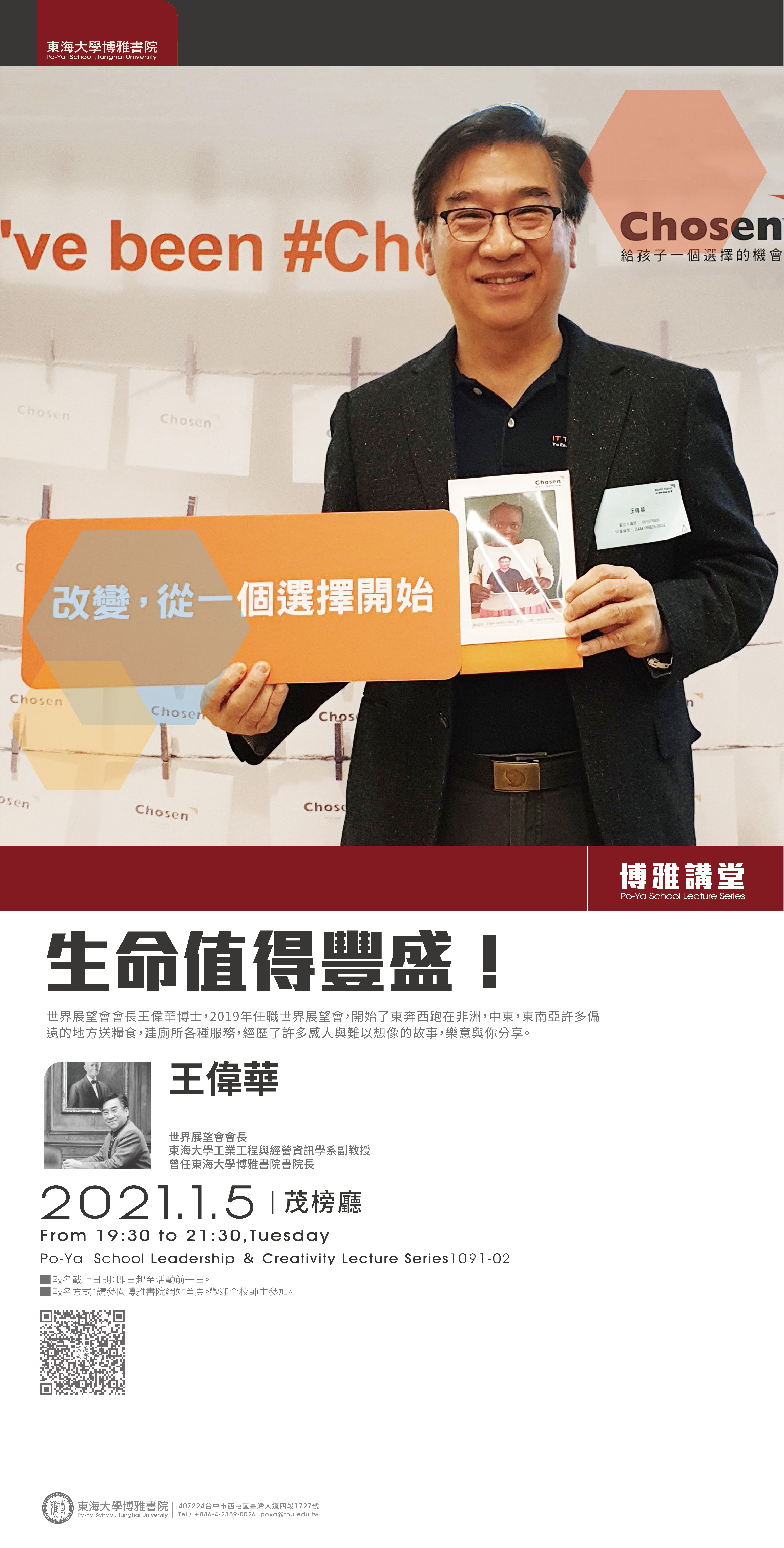 109學年度第二場博雅講堂邀請到台灣世界展望會會長王偉華先生蒞校開講,以「生命值得豐盛!」為題,分享於展望會任職近兩年來的所見所聞,及其歷經的箇中感動。難得的機遇,誠摯邀請全校師生及您身邊的親朋好友一同來聆聽。