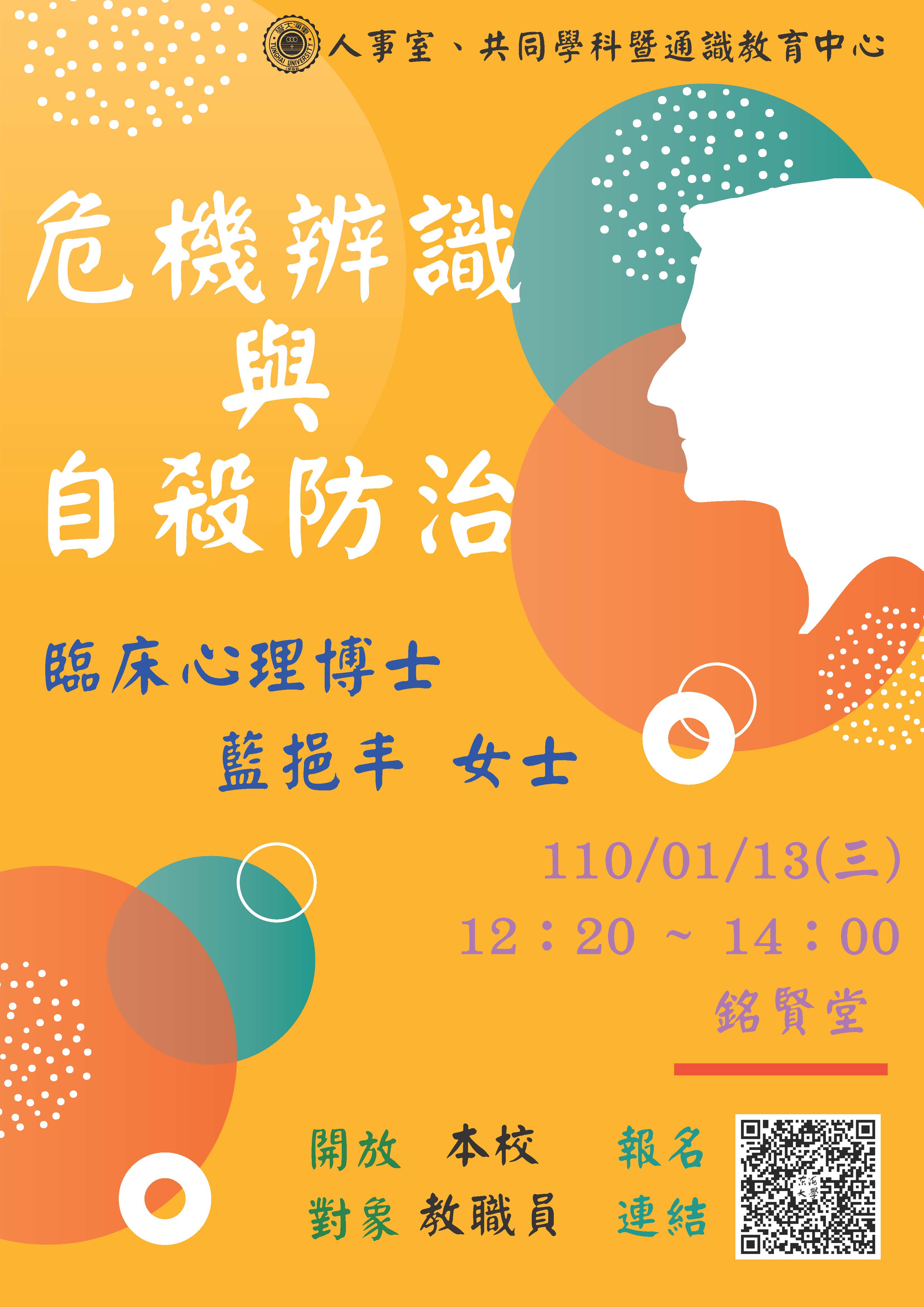 | 危機辨識與自殺防治 加入Google行事曆 | 銘賢堂 | 2021-01-13 ~ 2021-01-13 | 12:00 ~ 14:00 | 2 | 150 | 157 |