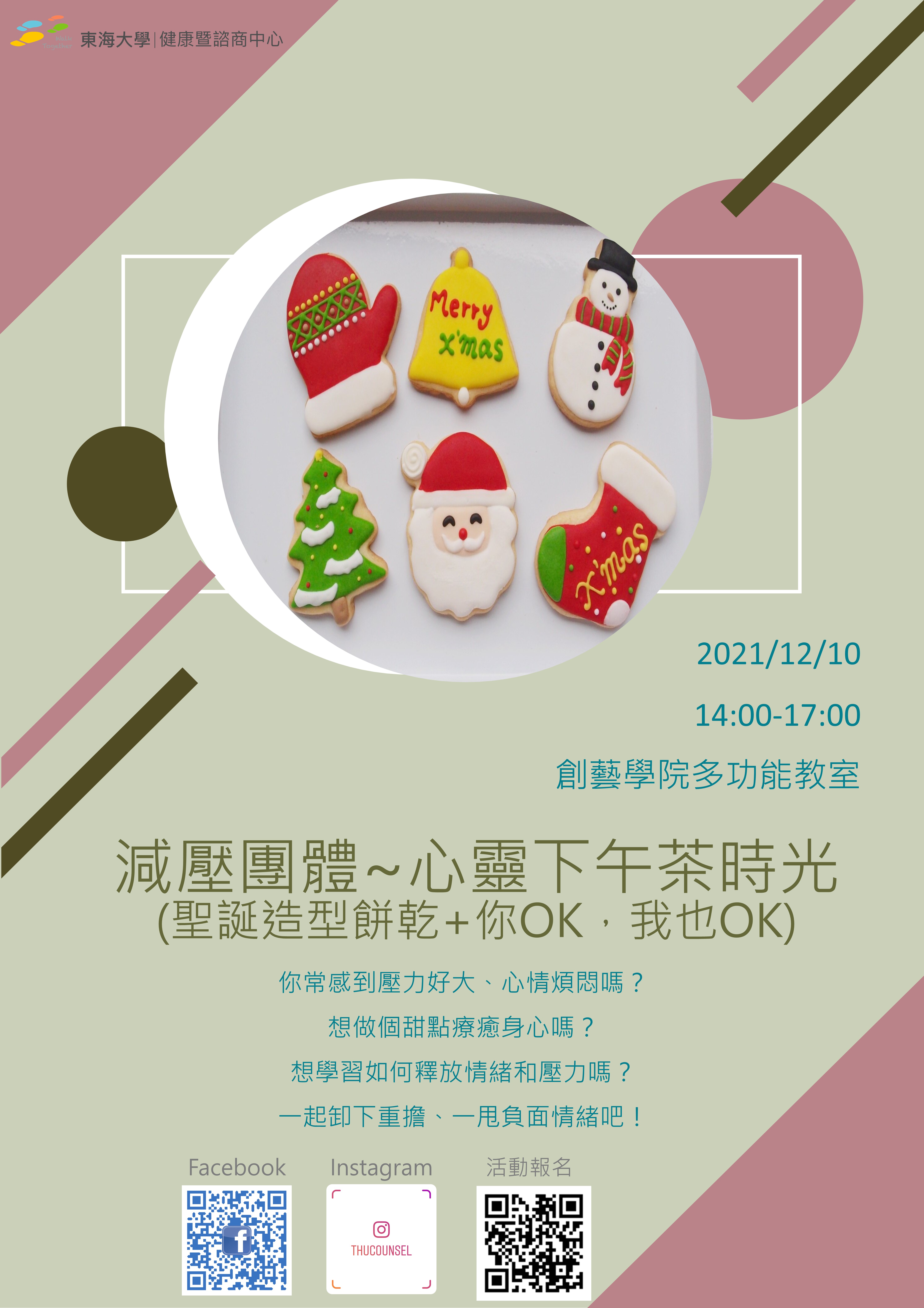 | 聖誕造型餅乾+你OK,我也OK! 加入Google行事曆 | 創藝學院社團專業教室(1F調酒社) | 2021-12-10 ~ 2021-12-10 | 14:00 ~ 17:00 | 3 | 30 | 30 |