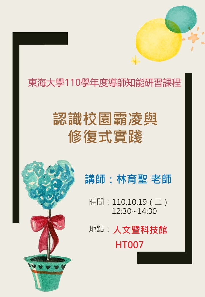 | 東海大學110學年度導師知能研習課程-認識校園霸凌與修復式實踐 加入Google行事曆 | 人文暨科技館 - HT007 | 2021-10-19 ~ 2021-10-19 | 12:30 ~ 14:30 | 2 | 50 | 33 |