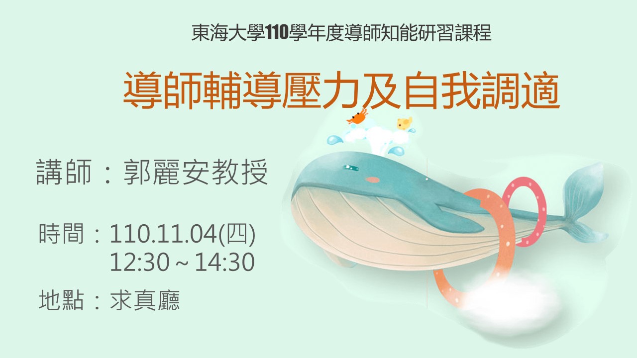 | 東海大學110學年度導師知能研習課程-導師輔導壓力及自我調適 加入Google行事曆 | 基礎科學館求真廳 | 2021-11-04 ~ 2021-11-04 | 12:30 ~ 14:30 | 2 | 70 | 61 |