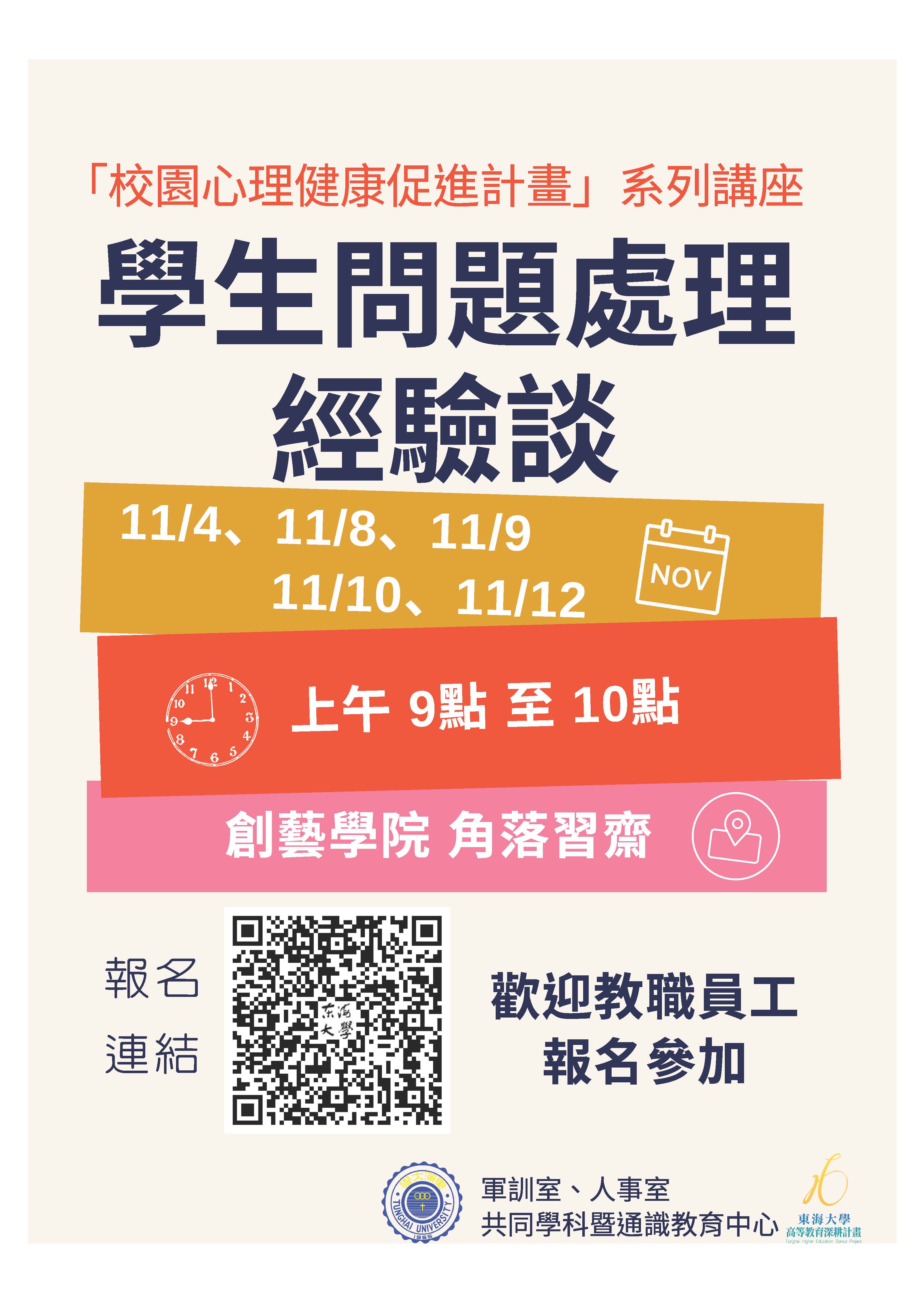 為幫助學生透過課程學習及活動參與等方式,建立正確之價值觀,瞭解日常生活中可能遇到的困擾、可參考的解決方法、可尋求的資源,並協助相關人員提升專業知能、增加敏感度,以期師生共同營造溫馨關懷之校園氛圍,並將資源整合、交流與相互學習的機會,特辦理此系列增能工作坊。