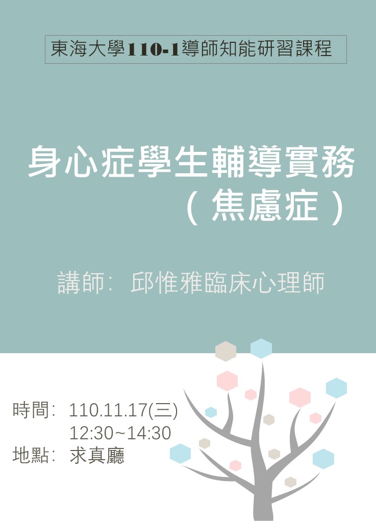 | 東海大學110-1校園心理健康促進計畫-導師知能研習課程-身心症學生輔導實務(焦慮症) 加入Google行事曆 | 基礎科學館求真廳 | 2021-11-17 ~ 2021-11-17 | 12:30 ~ 14:30 | 2 | 70 | 60 |