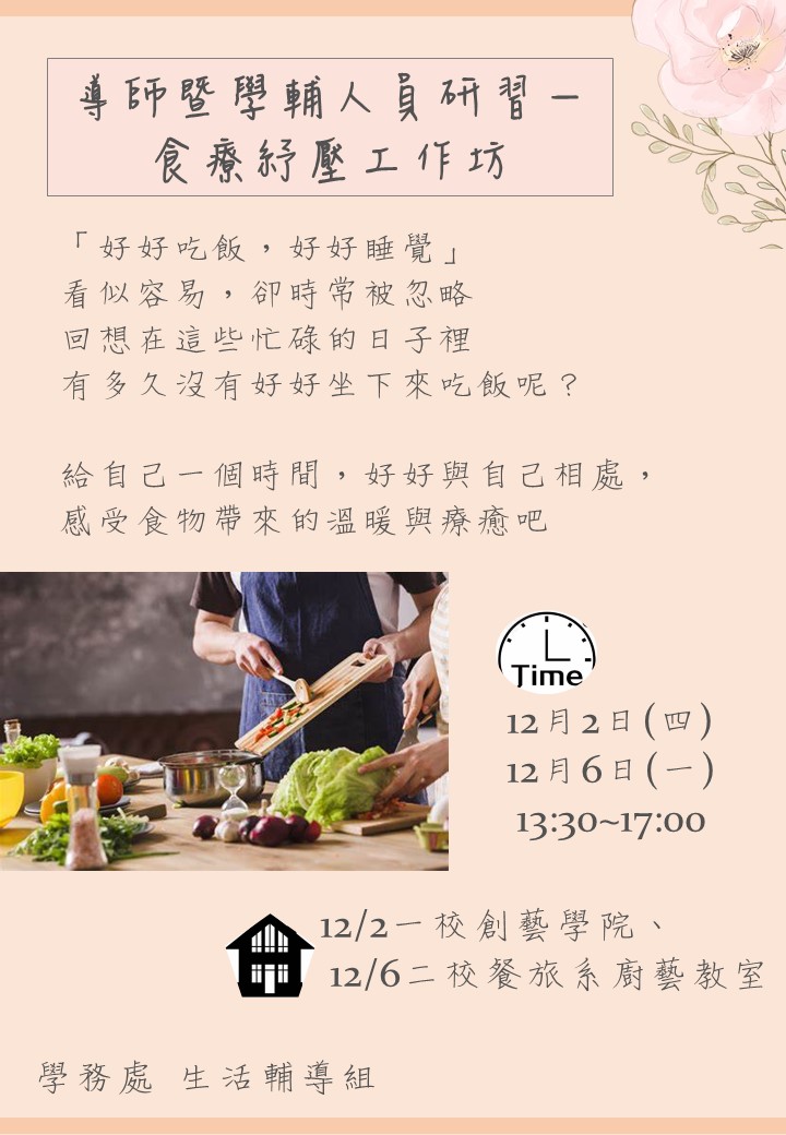 | 導師暨學輔人員研習-食療紓壓工作坊(場次2) 加入Google行事曆 | 餐旅管理學系M214廚藝教室 | 2021-12-06 ~ 2021-12-06 | 13:30 ~ 17:00 | 3.5 | 30 | 23 |
