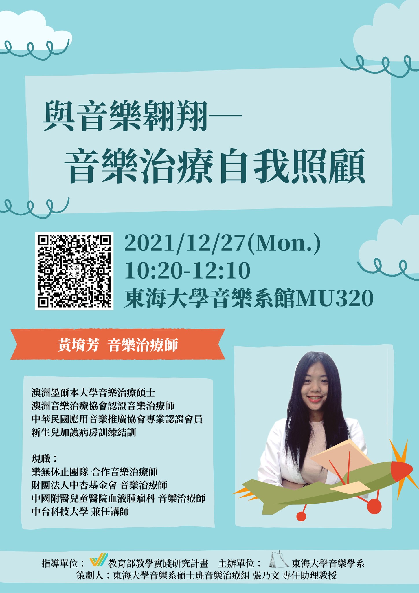 | 教育部教學實踐研究計畫講座-與音樂翱翔:音樂治療自我照顧 加入Google行事曆 | MU320 | 2021-12-27 ~ 2021-12-27 | 10:20 ~ 12:10 | 2 | 40 | 39 |
