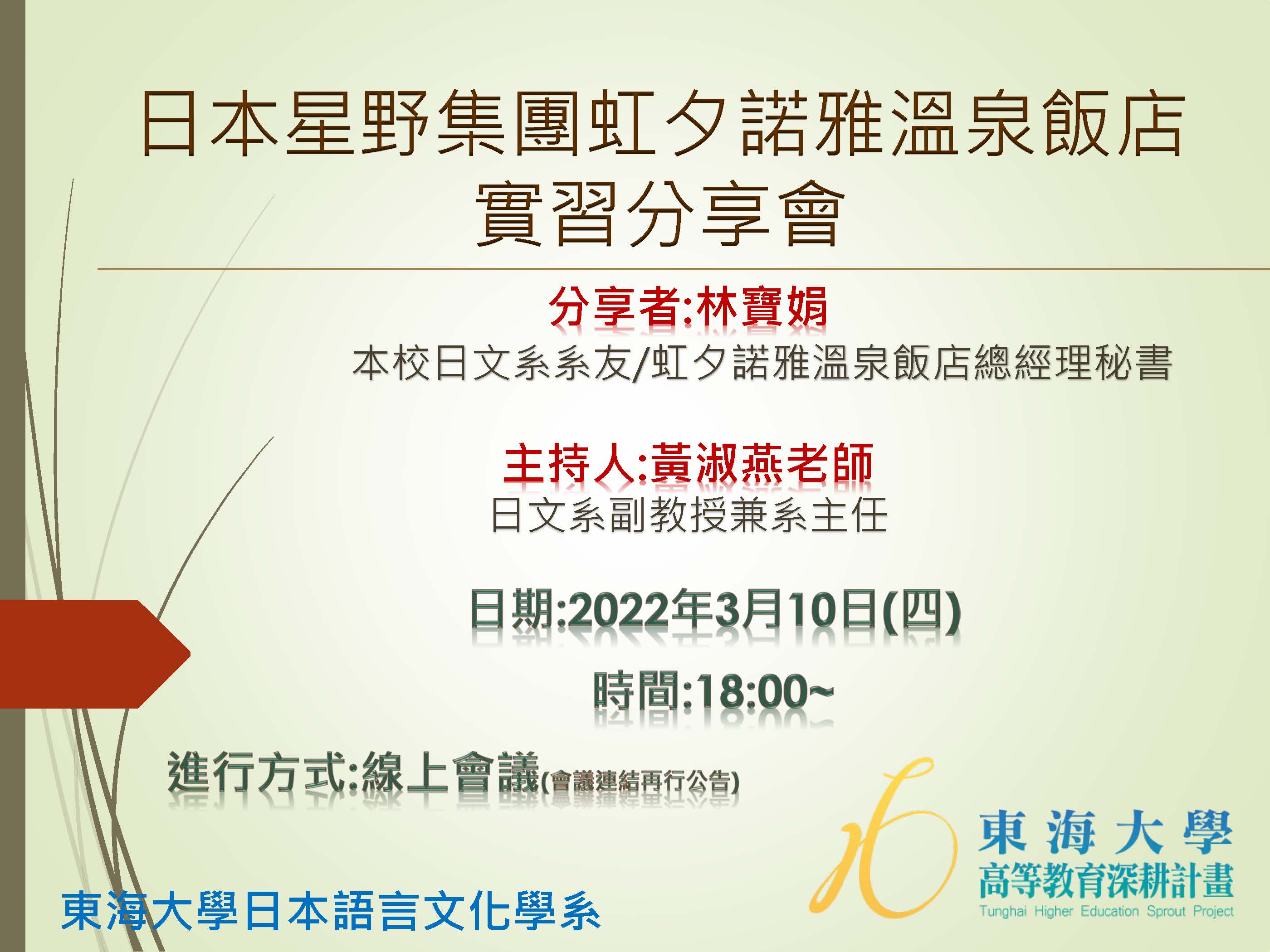 邀請本系系友林寶娟小姐(109學年參加實習,目前為該飯店之總經理秘書)分享從實習生到正式職員的歷程與經驗分享。期使讓有意參與職場實習的同學了解不同產業的職場文化、汲取職場實務經驗,以增進未來進入職場的適應能力。!!~有意參加2022年實習同學請務必參加~!!