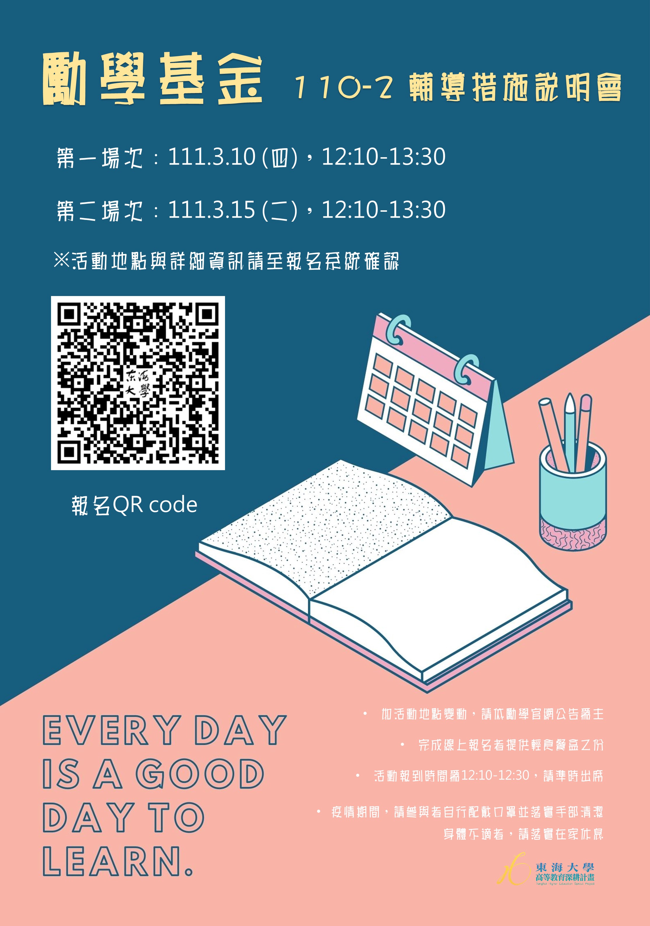 為了讓經濟不利學生於在學期間可以安心學習,不再因生活壓力而影響課業上的學習,東海大學特辦理勵學基金輔導措施,由課業輔導、職涯輔導、領袖培力、服務實踐、學習型實習、各系專業服務實踐、餐食補助等七大面向開始,鼓勵同學們積極參與達到提升自我能力並回饋社會之目標!相關輔導機制將於本次說明會介紹,誠摯邀請符合相關資格的同學們踴躍參加。