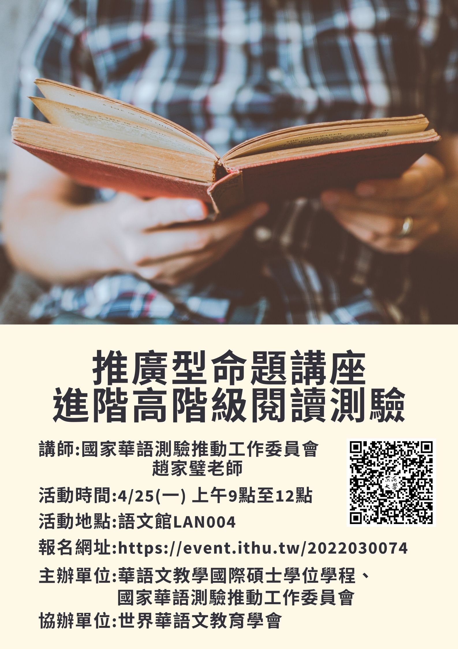 此場推廣型命題講座將由國家華語測驗推動工作委員會的資深講師介紹進階高階級(Band B)閱讀測驗的命題原則,並使用與華語文能力測驗形式相同的題目進行試題分析的實作練習。歡迎對華語文領域有興趣的同學、華語老師參加!