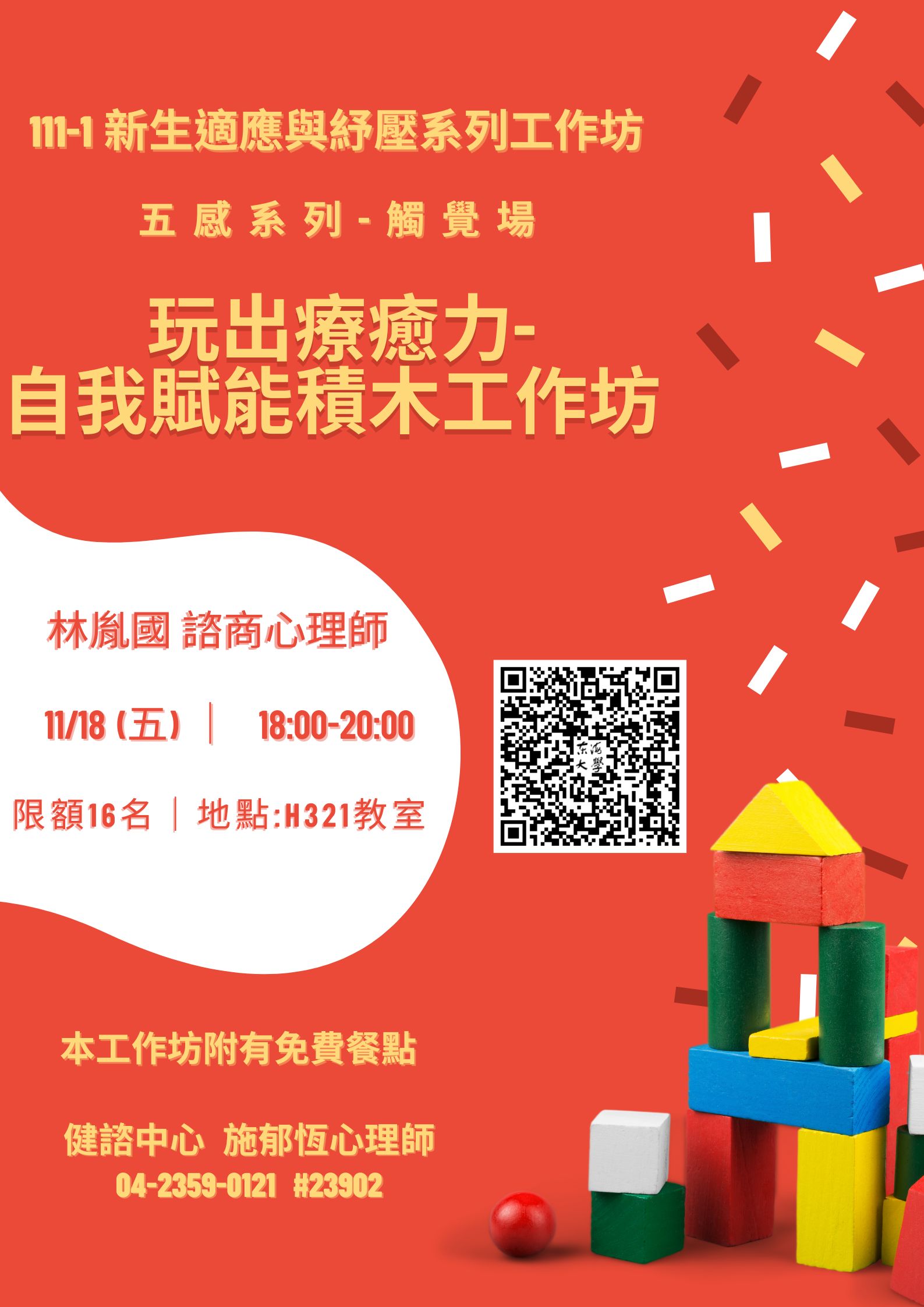 | 觸覺場-玩出療癒力-自我賦能積木工作坊 加入Google行事曆 | 人文大樓 H321教室 | 2022-11-18 ~ 2022-11-18 | 18:00 ~ 20:00 | 2 | 16 | 12 |
