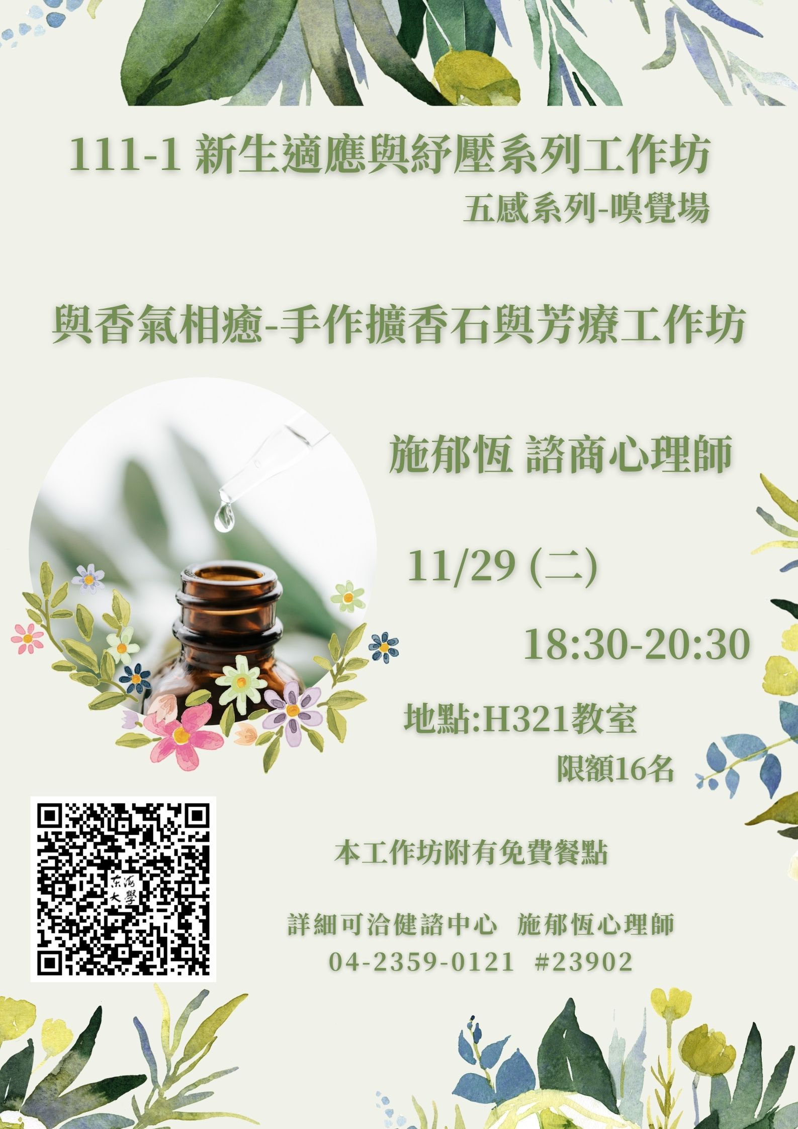 嗅覺場- 與香氣相癒-手作擴香石與芳療工作坊 加入Google行事曆 | 人文大樓 H321教室 | 2022-11-29 ~ 2022-11-29 | 18:30 ~ 20:30 | 2 | 22 | 22 |