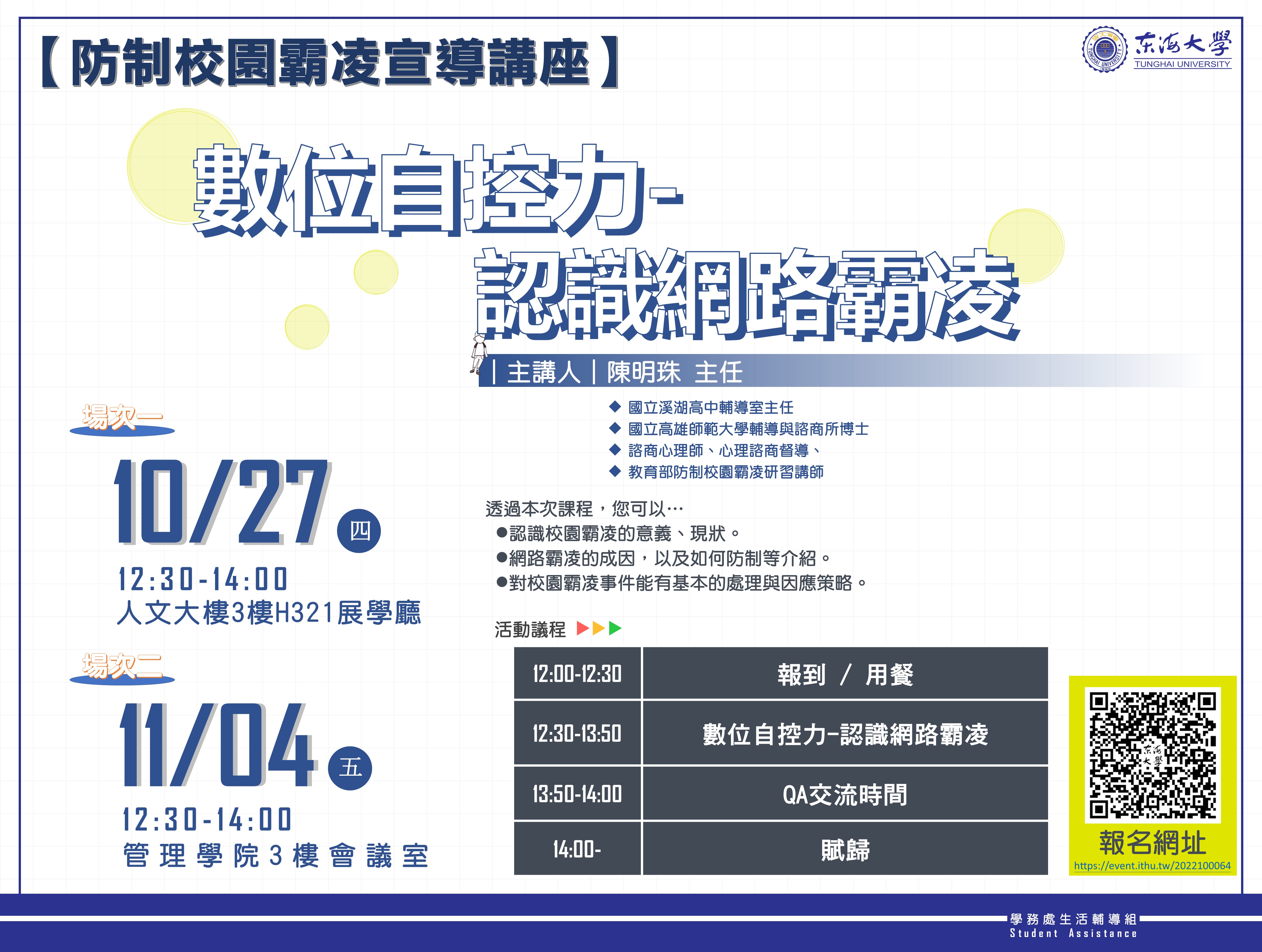 | 數位自控力--認識網路霸凌(場次一) 加入Google行事曆 | 人文大樓三樓展學廳(H321) | 2022-10-27 ~ 2022-10-27 | 12:30 ~ 14:00 | 1.5 | 24 | 24 |
