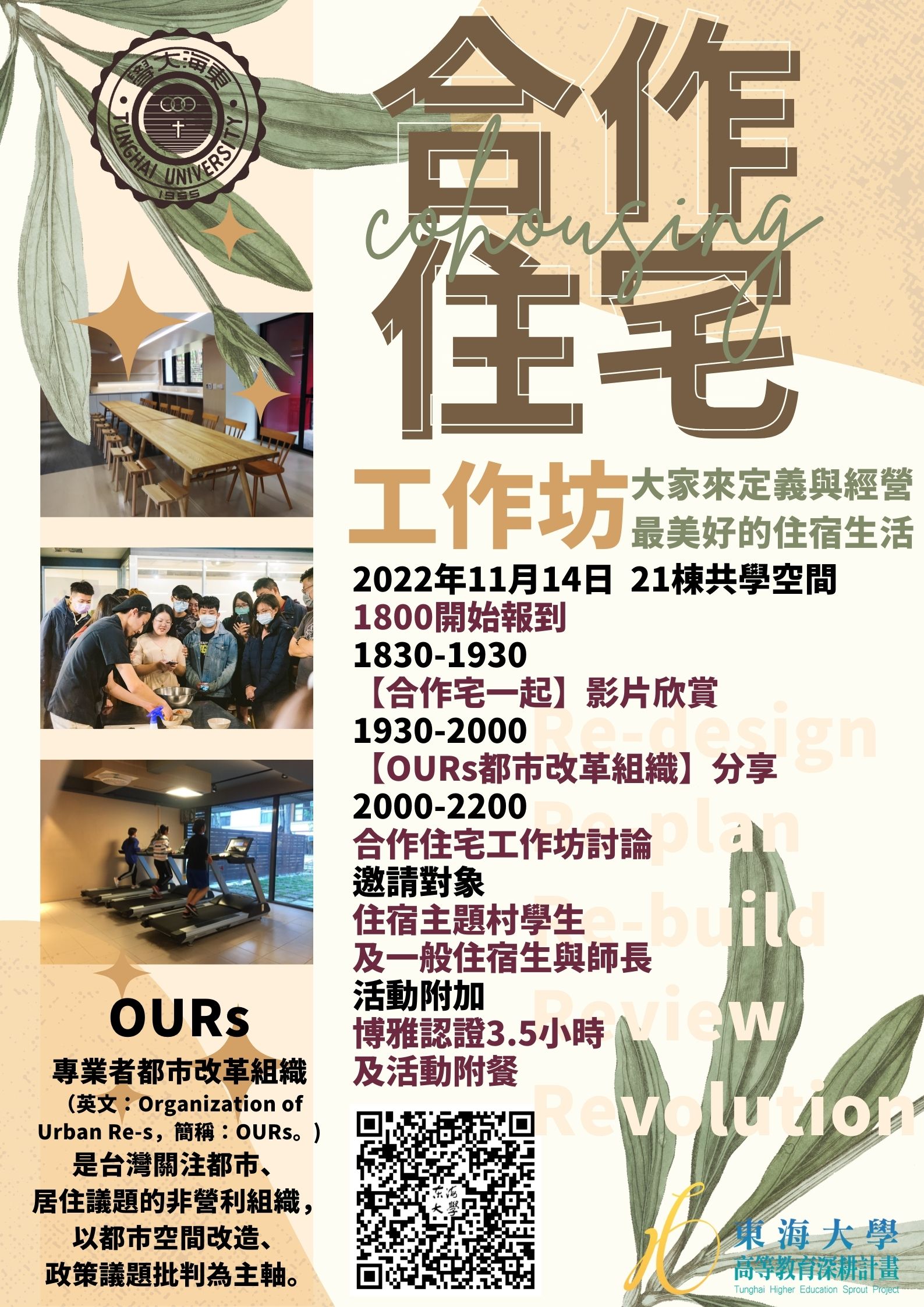 | 11/14住宿主題村-合作住宅工作坊 加入Google行事曆 | 21棟共學空間 | 2022-11-14 ~ 2022-11-14 | 18:30 ~ 22:00 | 3.5 | 30 | 24 |