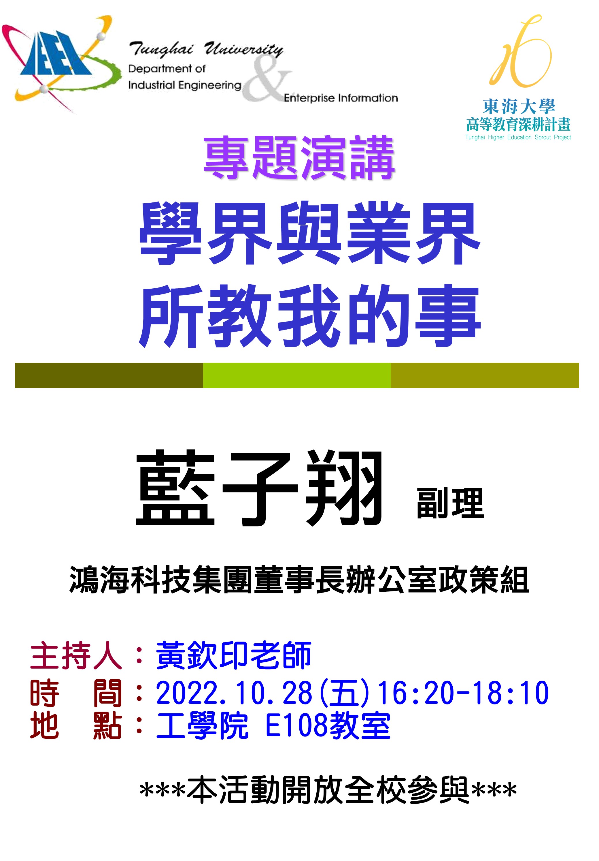 | 【工工系專題演講】10/28 學界與業界所教我的事 加入Google行事曆 | 東海大學工學院 E108教室 | 2022-10-28 ~ 2022-10-28 | 16:20 ~ 18:10 | 1.5 | 60 | 101 |