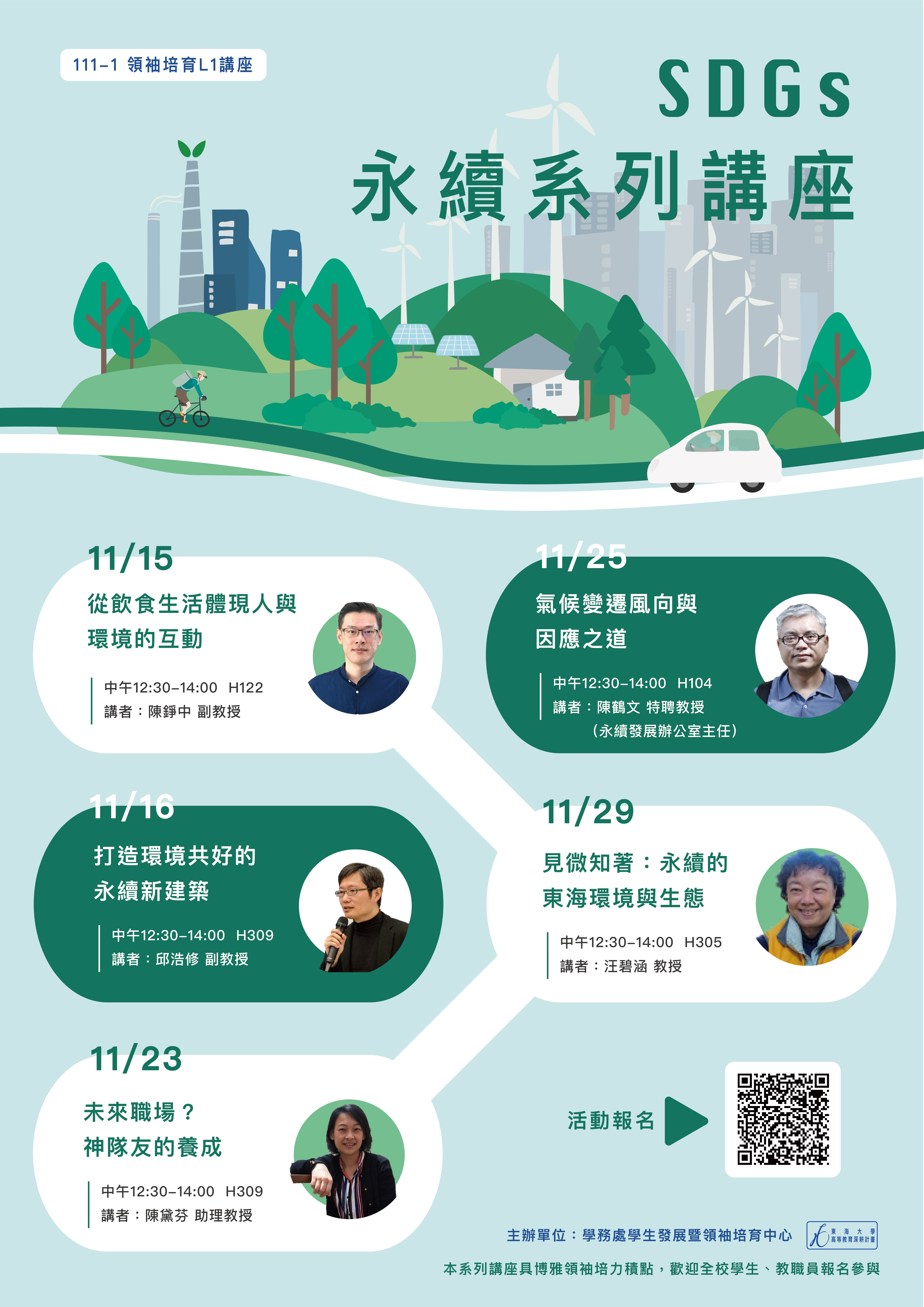 | ✦領培L1-永續系列講座【見微知著:永續的東海環境與生態】汪碧涵教授-11/29(二) 加入Google行事曆 | H305 | 2022-11-29 ~ 2022-11-29 | 12:30 ~ 14:00 | 1.5 | 50 | 51 |