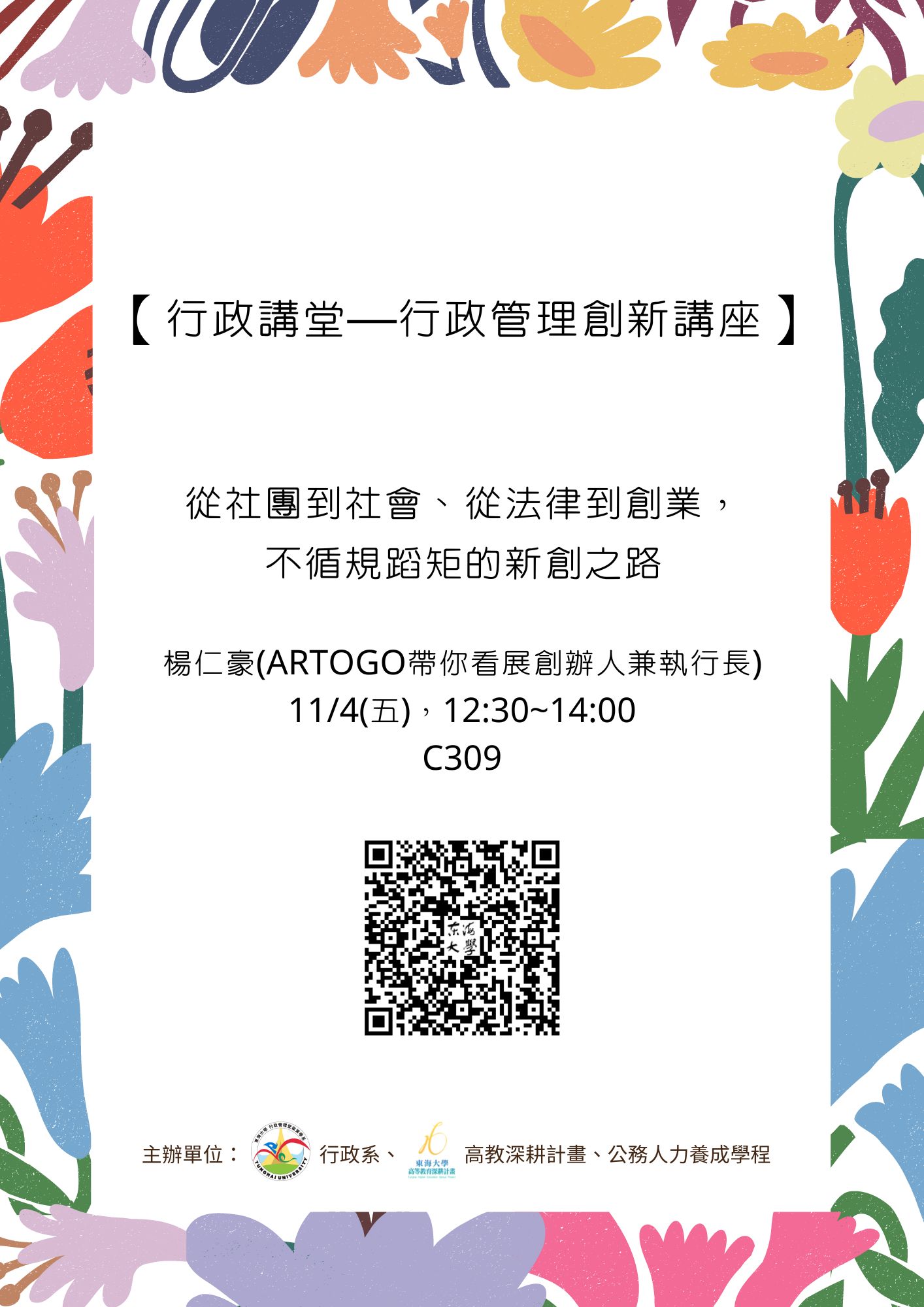 | 從社團到社會、從法律到創業,不循規蹈矩的新創之路 加入Google行事曆 | C309 | 2022-11-04 ~ 2022-11-04 | 12:30 ~ 14:00 | 1 | 40 | 37 |