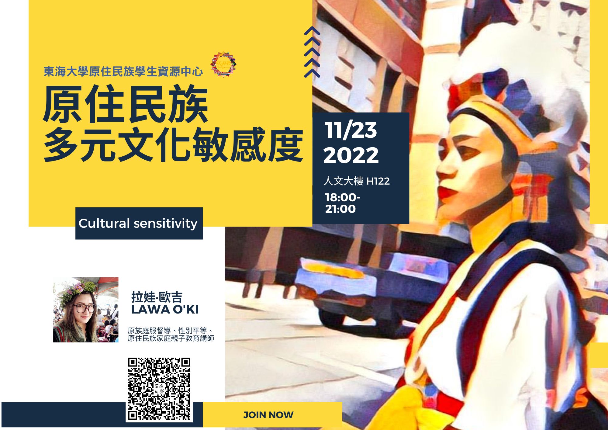 | 【原資中心】原住民族多元文化敏感度講座 加入Google行事曆 | 人文大樓 H122 | 2022-11-23 ~ 2022-11-23 | 18:00 ~ 21:00 | 3 | 30 | 13 |