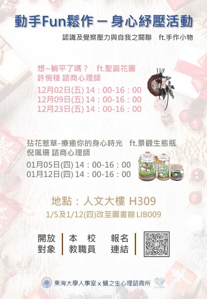 配合教育部【校園心理健康促進計畫】,本室與蛹之生心理諮商所合作開設課程講座,希望透過心理師帶領教職員同仁認識及覺察壓力與自我之關聯,並藉由加入手作元素以增添課程豐富度及多元性。