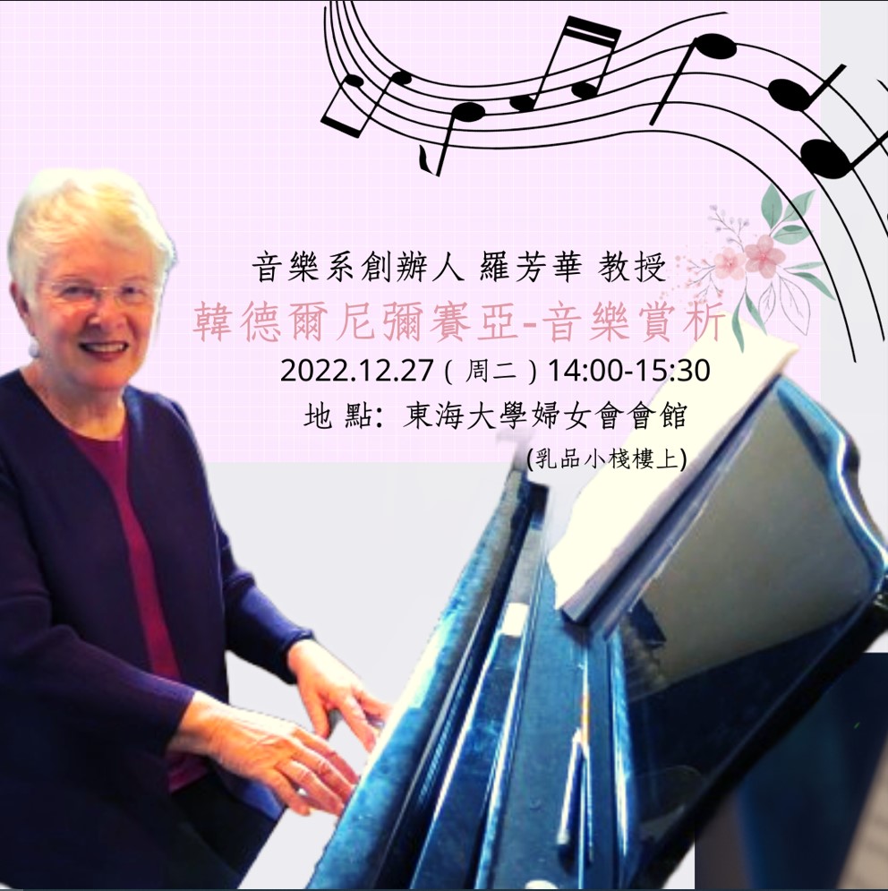 | 音樂大師 羅芳華 教授 難得精彩授課音樂賞析 《 韓德爾尼彌賽亞》 加入Google行事曆 | 東海大學婦女會會館 | 2022-12-27 ~ 2022-12-27 | 14:00 ~ 15:30 | 1.5 | 20 | 9 |