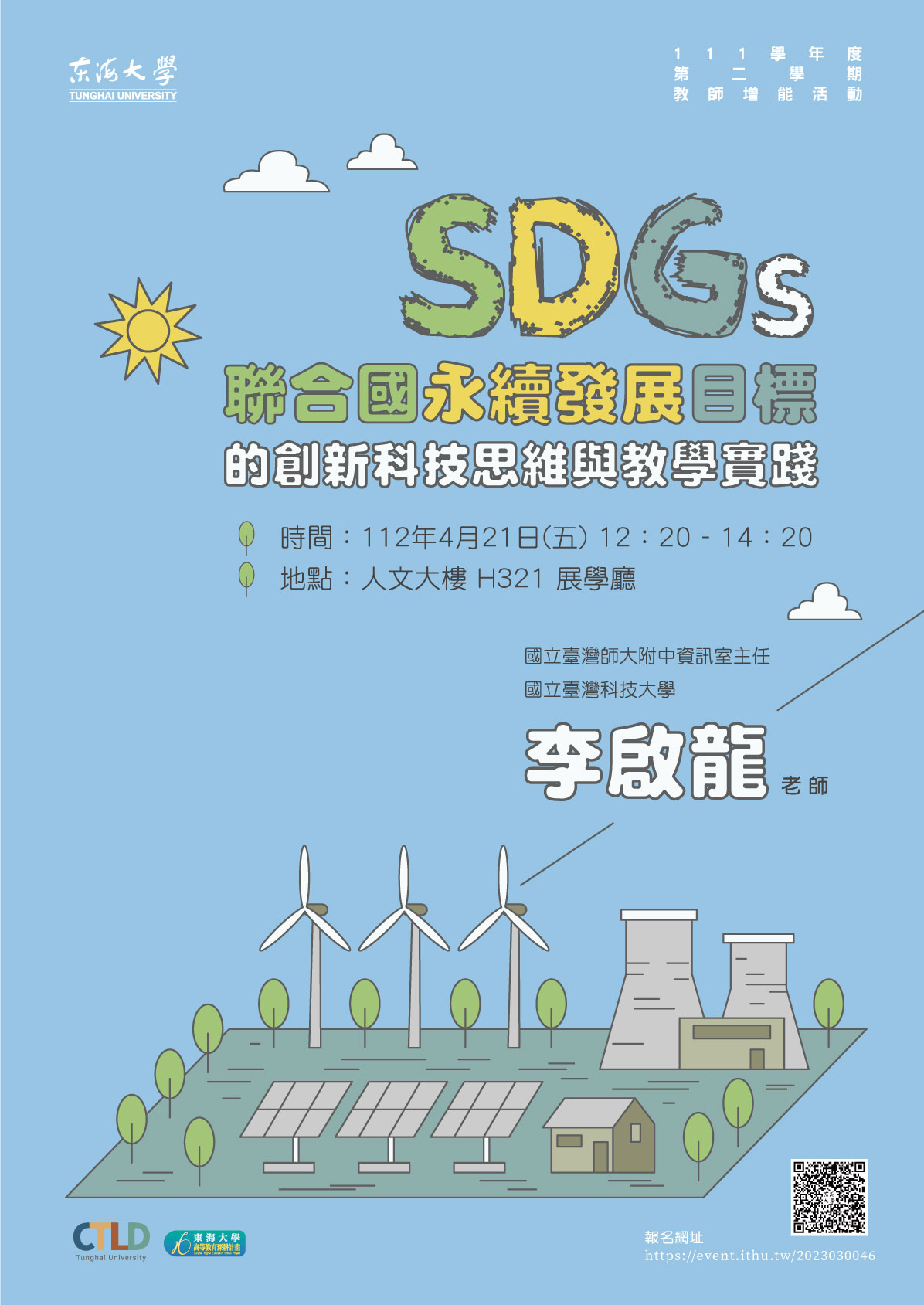 | 聯合國永續發展目標SDGs的創新科技思維與教學實踐 加入Google行事曆 | 人文大樓 H321 展學廳 | 2023-04-21 ~ 2023-04-21 | 12:20 ~ 14:20 | 2 | 35 | 38 |