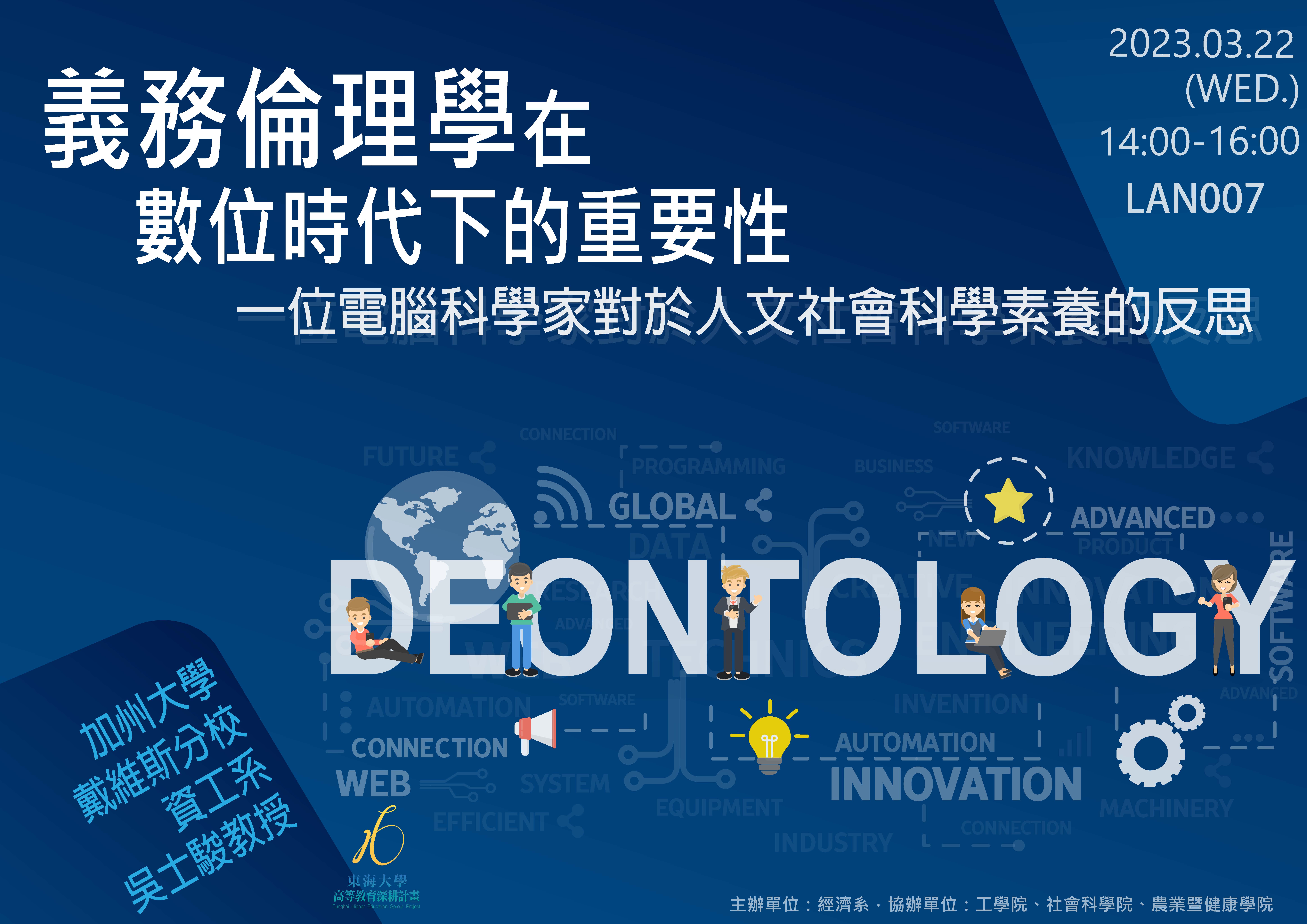 本校工學院、社科院、農健學院、及經濟系合作邀請美國加利福尼亞大學戴維斯分校(University of California Davis)資訊工程學系教授吳士駿(S. Felix Wu)--本校第二十七屆畢業校友,1985年畢業於資訊科學系(現已改名為資訊工程系),1995年獲得美國哥倫比亞大學資訊工程博士,2018獲得本校第18屆傑出校友。以論義務倫理學(Deontology)在數位時代下的重要性---一位電腦科學家對於人文社會科學素養的反思為題,於 2023.03.22週三下午2-4點在求真廳演講。
