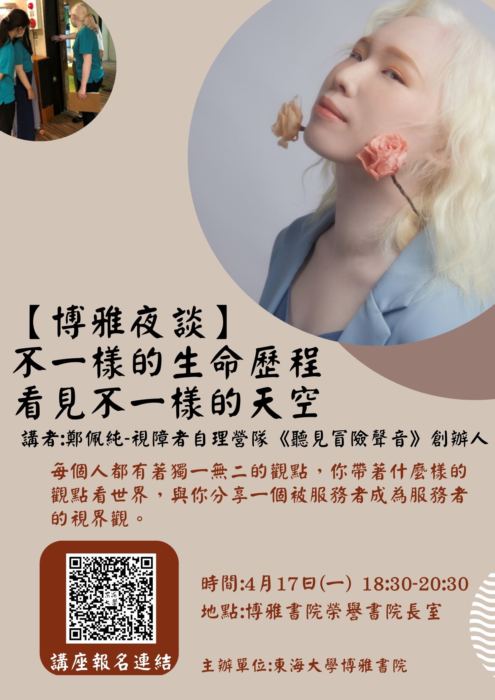 | 博雅夜談【不一樣的生命歷程、看見不一樣的天空】 加入Google行事曆 | 榮譽書院長室 | 2023-03-15 ~ 2023-04-17 | 18:30 ~ 20:30 | 2 | 20 | 20 |