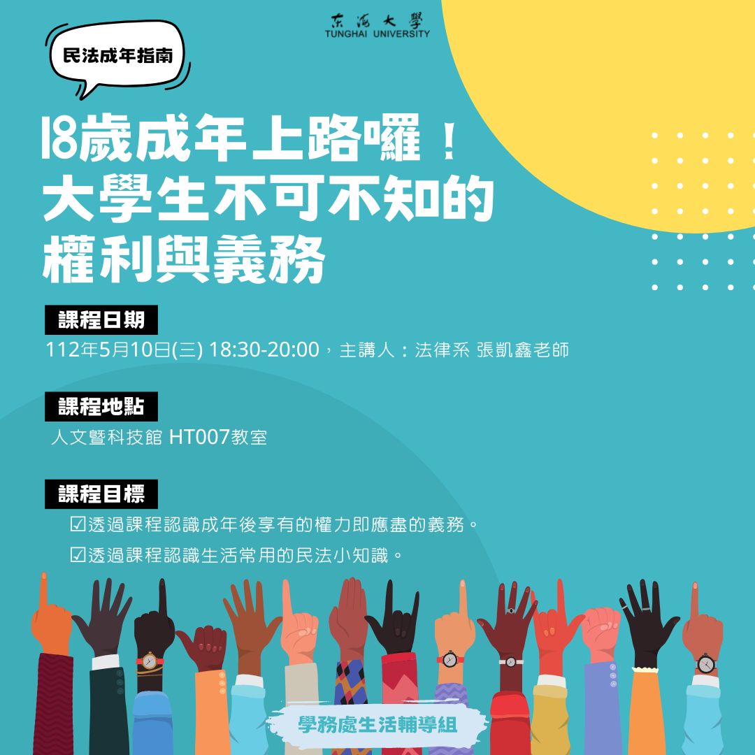 | 5/10-18歲成年上路囉!大學生不可不知的權利與義務 加入Google行事曆 | 人文暨科技館 HT007教室 | 2023-05-10 ~ 2023-05-10 | 18:30 ~ 20:00 | 1.5 | 60 | 58 |