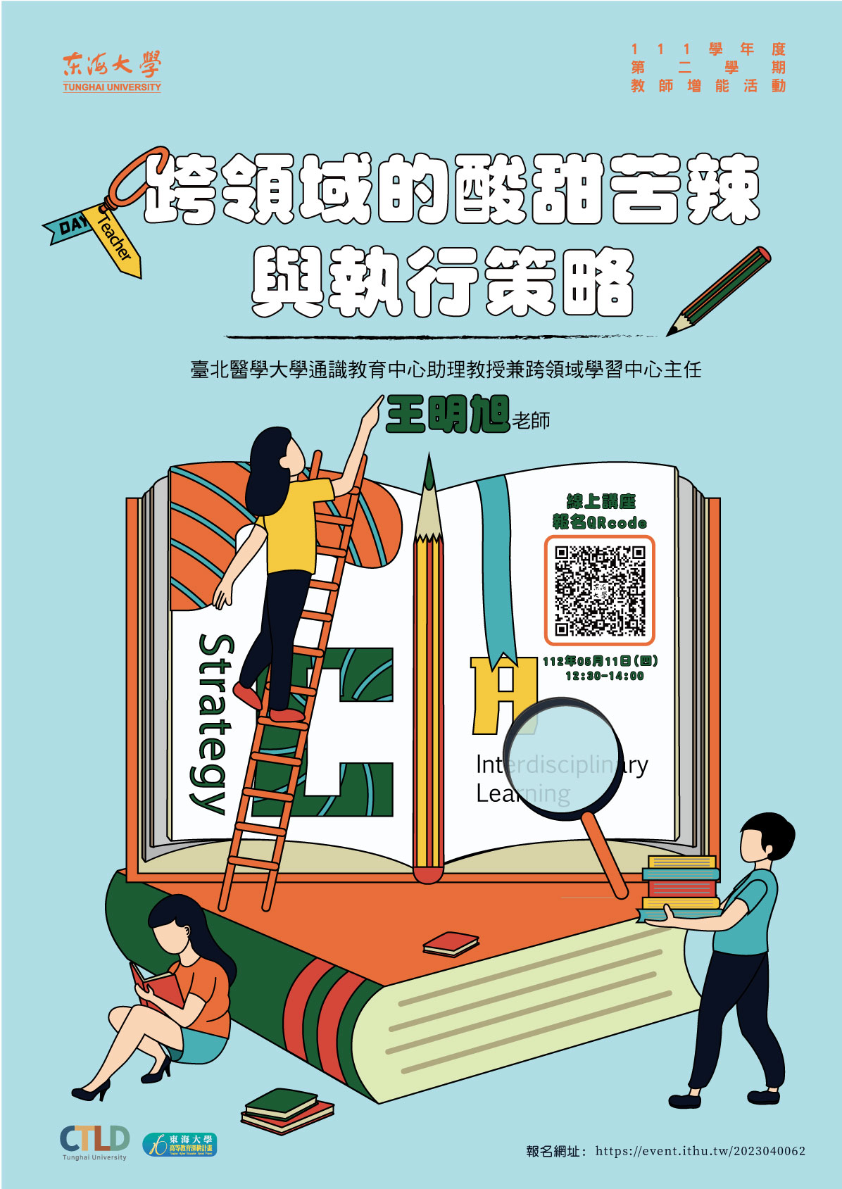 | 【教師增能活動】跨領域的酸甜苦辣與執行策略 加入Google行事曆 | Google meet 線上講座 https://ithu.tw/9ZFwW | 2023-05-11 ~ 2023-05-11 | 12:30 ~ 14:00 | 1.5 | 100 | 61 |