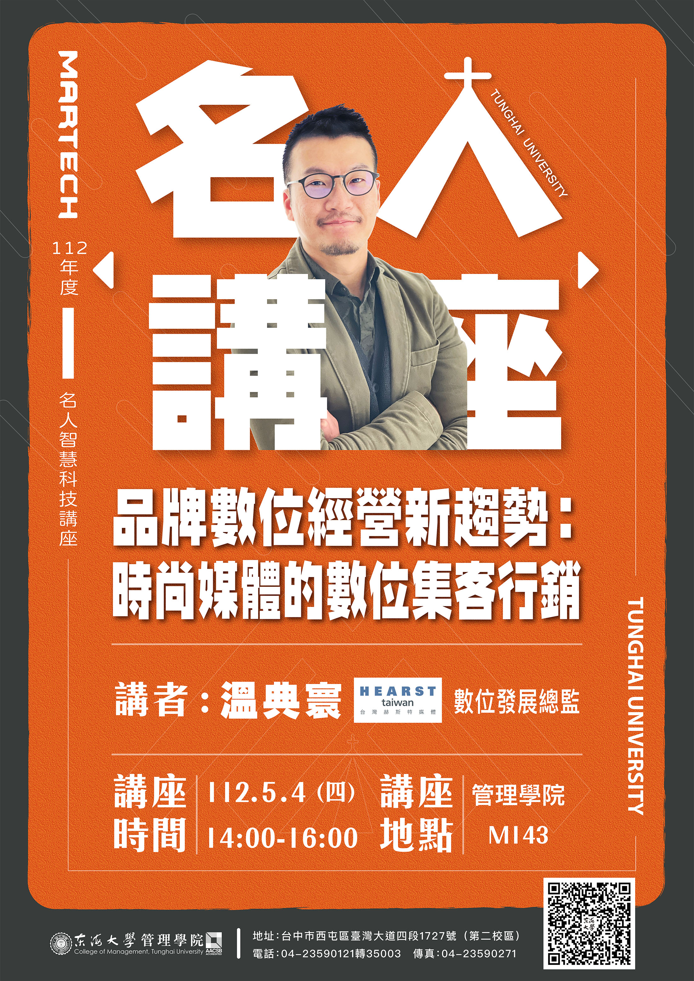 東海大學管理學院很榮幸邀請到台灣赫斯特媒體集團資深數位發展總監以【品牌數位經營新趨勢:時尚媒體的數位集客行銷】為題,介紹時尚媒體的數位集客行銷的新趨勢和方法,包括如何運用社交媒體平台進行行銷,如何運用數據分析和人工智慧技術進行行銷策略的制定和優化等。同時,也將分享一些成功案例,希望能夠為大家提供一些啟示和參考。