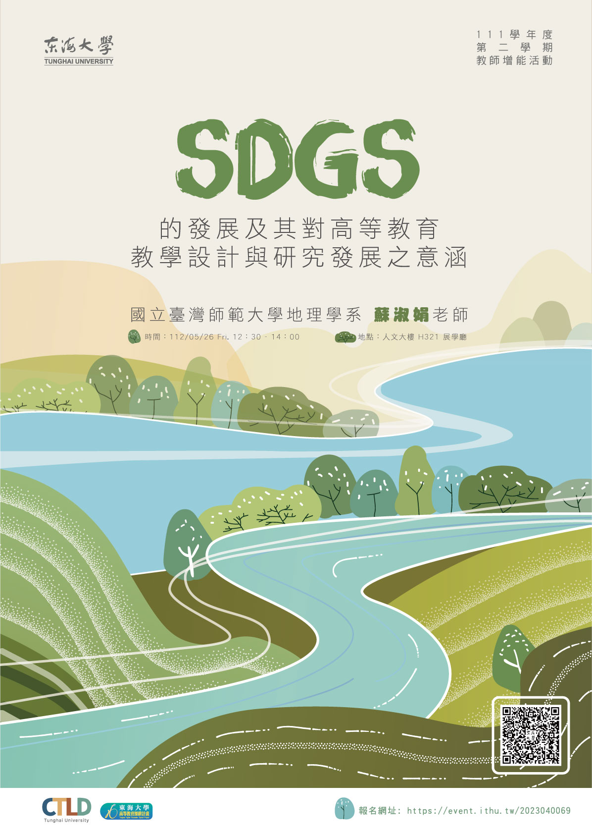 | 【教師增能活動】SDGs的發展及其對高等教育教學設計與研究發展之意涵 加入Google行事曆 | 人文大樓 展學聽 H321 | 2023-05-26 ~ 2023-05-26 | 12:30 ~ 14:00 | 1.5 | 35 | 48 |