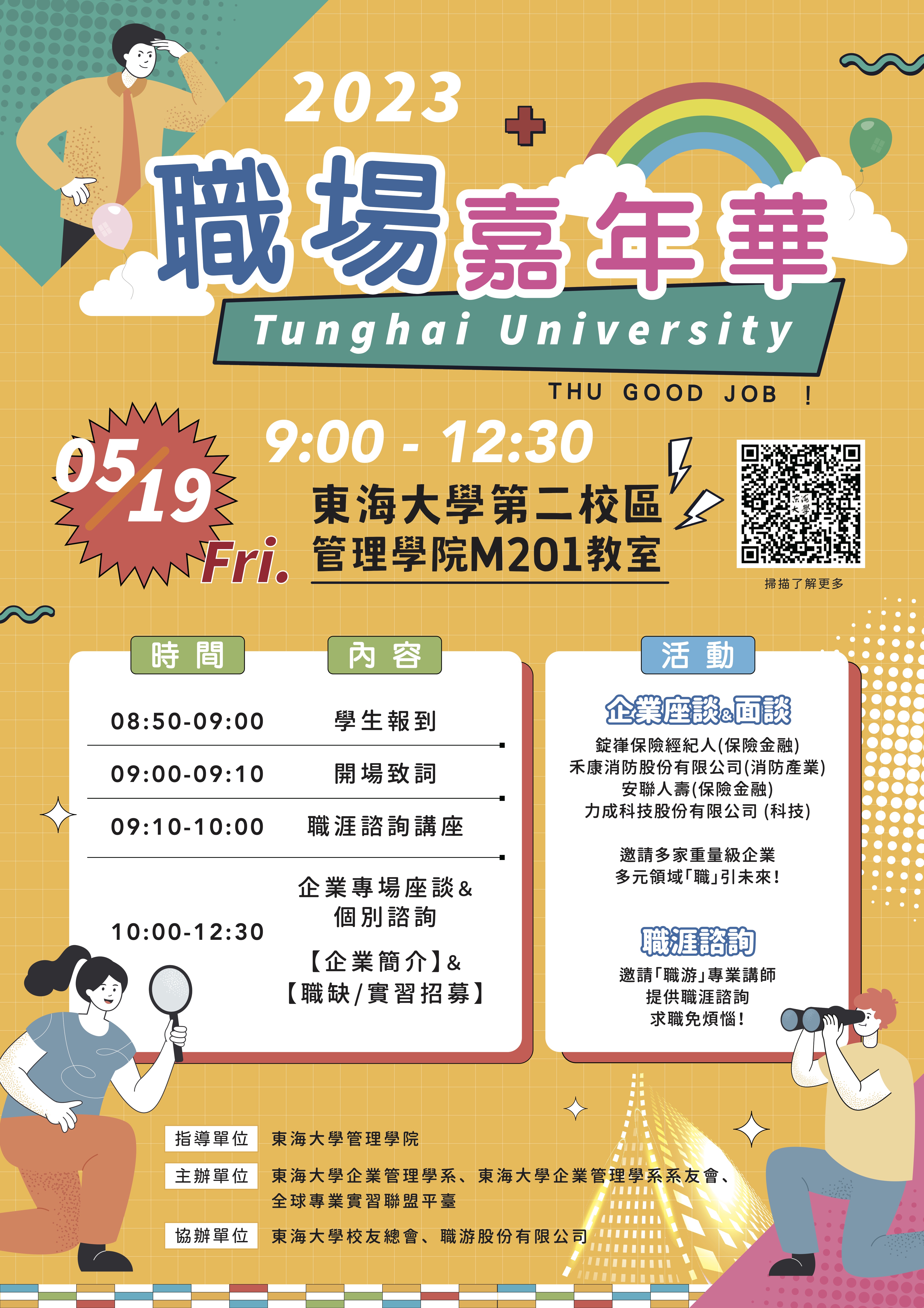 東海大學職場嘉年華-邀請多家知名企業,橫跨4大產業領域,包含:錠嵂保險經紀人(保險金融)、國介企業股份有限公司(消防產業)、安聯人壽(保險金融)、英商緣湧國際有限公司(精品銷售)、力成科技股份有限公司(科技)等企業來到東海大學,針對即將踏入職場的學生,深入面對面進行交流,並媒合職缺及實習機會。另外,這次我們還特別邀請了「職游」職涯諮詢專業團隊,提供學生職涯性向分析及心理測評,幫助學生發揮個人專長,全方面協助您從職涯起點就能站穩腳步。報名者提供餐點1份。