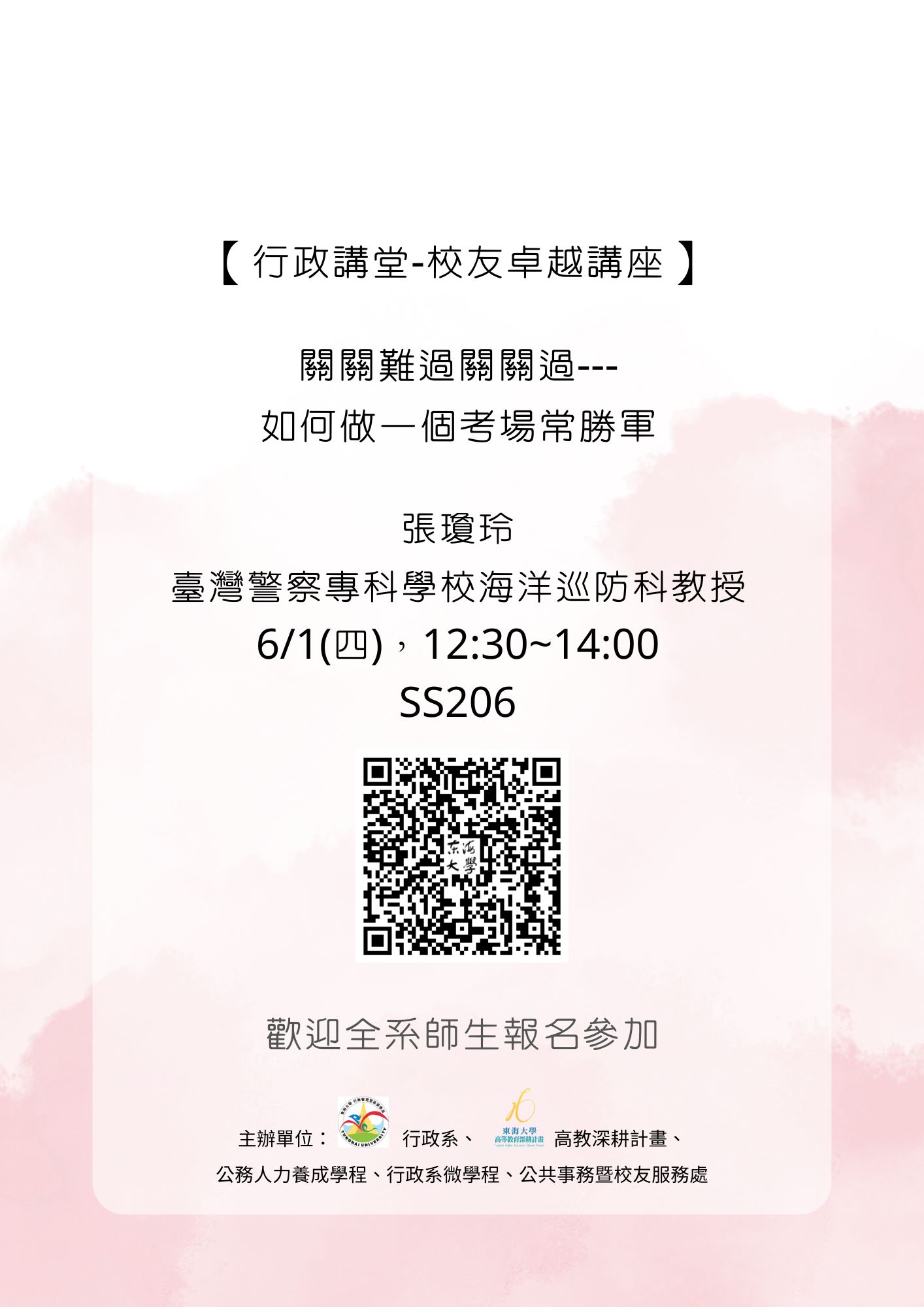 | 6/1(四),關關難過關關過---如何做一個考場常勝軍,張瓊玲。主辦單位:行政系、高教深耕計畫、公務人力養成學程、行政系微學程、公共事務暨校友服務處 加入Google行事曆 | SS206 | 2023-06-01 ~ 2023-06-01 | 12:30 ~ 14:00 | 1.5 | 100 | 87 |
