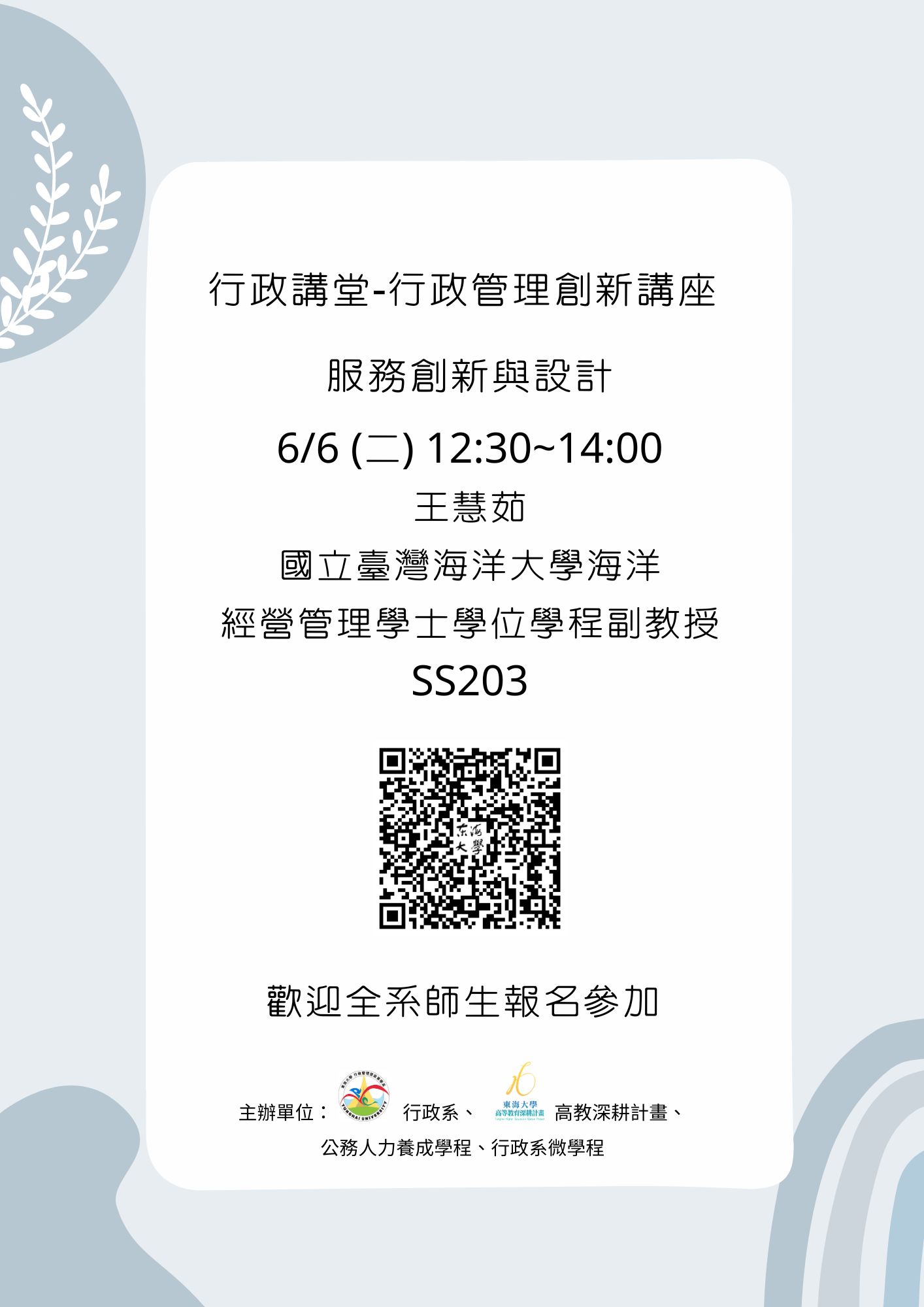 | 6/6(二),服務創新與設計。主辦單位:行政系、高教深耕計畫、公務人力養成學程、行政系微學程 加入Google行事曆 | SS524 | 2023-06-06 ~ 2023-06-06 | 12:30 ~ 14:00 | 1.5 | 55 | 58 |
