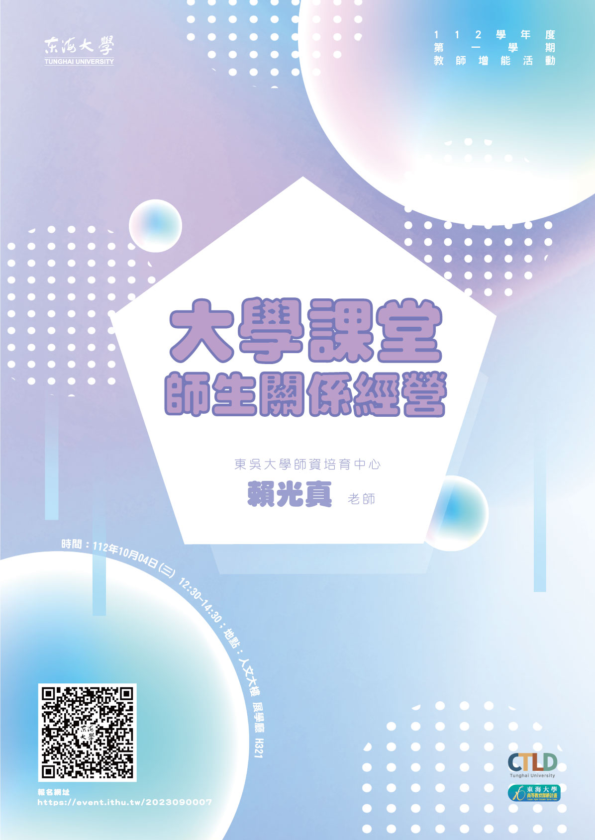 | 【教師增能活動】大學課堂師生關係經營 加入Google行事曆 | 人文大樓 展學廳 H321 | 2023-10-04 ~ 2023-10-04 | 12:30 ~ 14:30 | 2 | 40 | 50 |