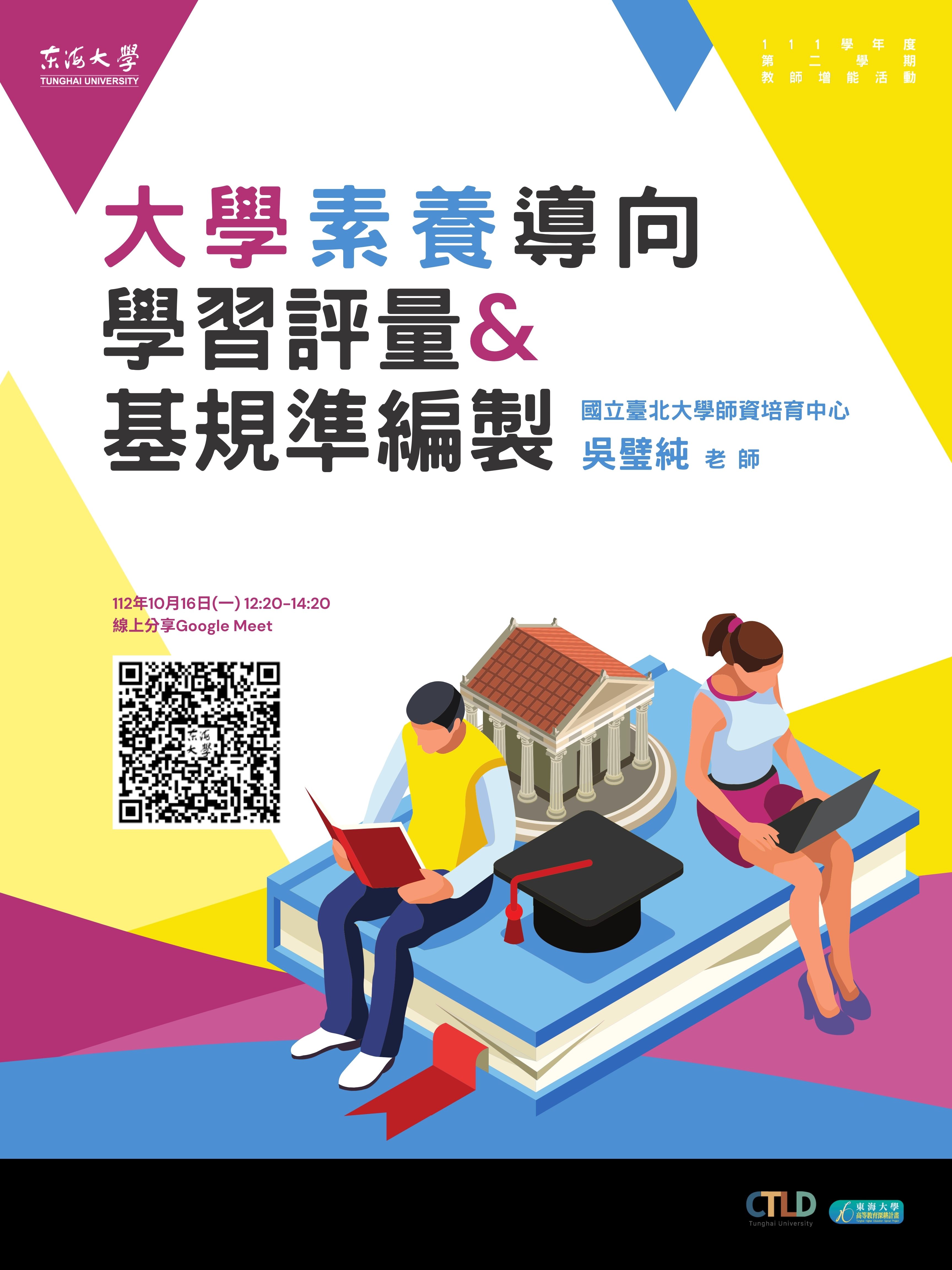 | 【教師增能活動】大學素養導向學習評量與基規準編製 加入Google行事曆 | 線上分享Google Meet | 2023-10-16 ~ 2023-10-16 | 12:20 ~ 14:20 | 2 | 100 | 97 |