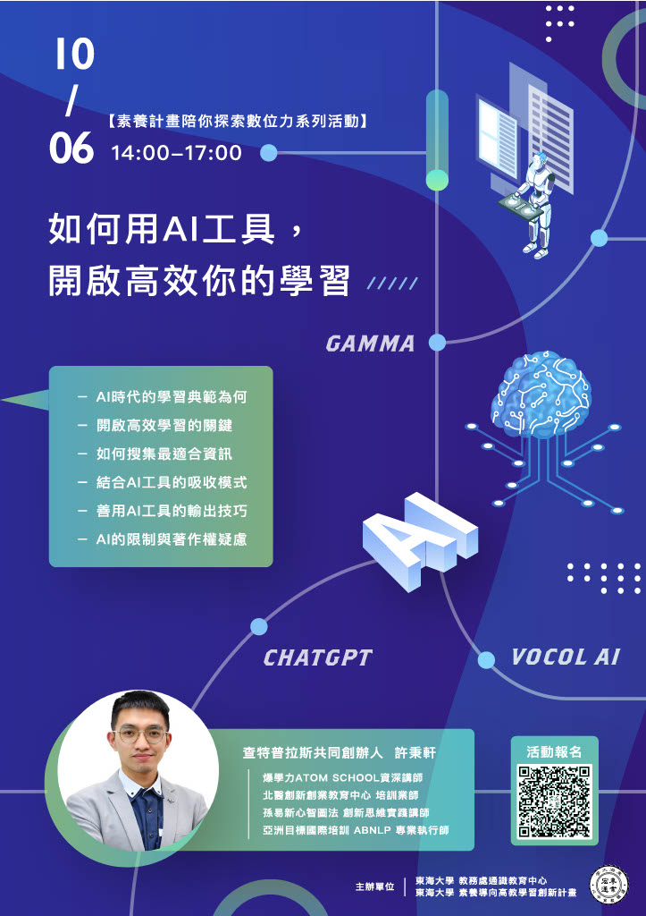 2023年10月東海大學素養導向高教學習創新計畫規劃一系列數位力活動,歡迎全校師生共同線上參與!