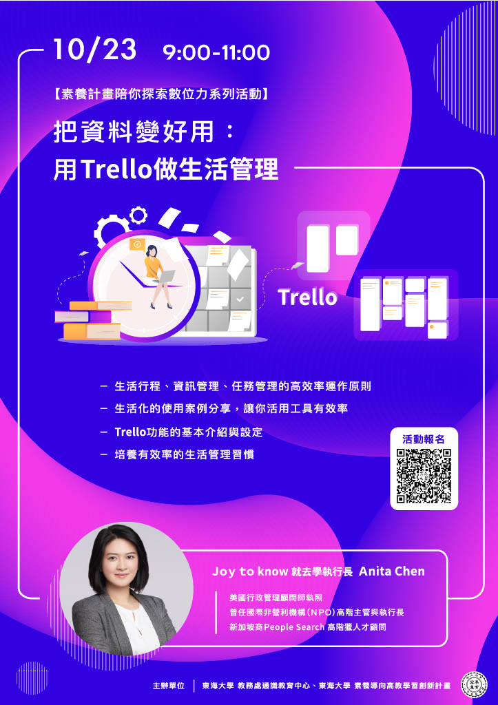 | 把資料變好用:用 Trello 做生活管理 加入Google行事曆 | google meet 線上會議(https://meet.google.com/ahp-amae-jem) | 2023-10-23 ~ 2023-10-23 | 09:00 ~ 11:00 | 2 | 不限 | 230 |