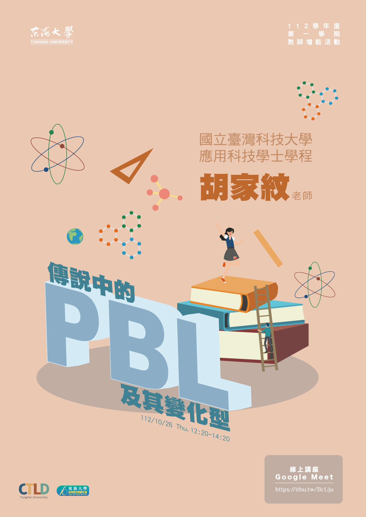 | 【教師增能活動】傳說中的PBL及其變化型 加入Google行事曆 | 線上分享Google Meet:https://ithu.tw/BcUju | 2023-10-26 ~ 2023-10-26 | 12:20 ~ 14:20 | 2 | 100 | 60 |