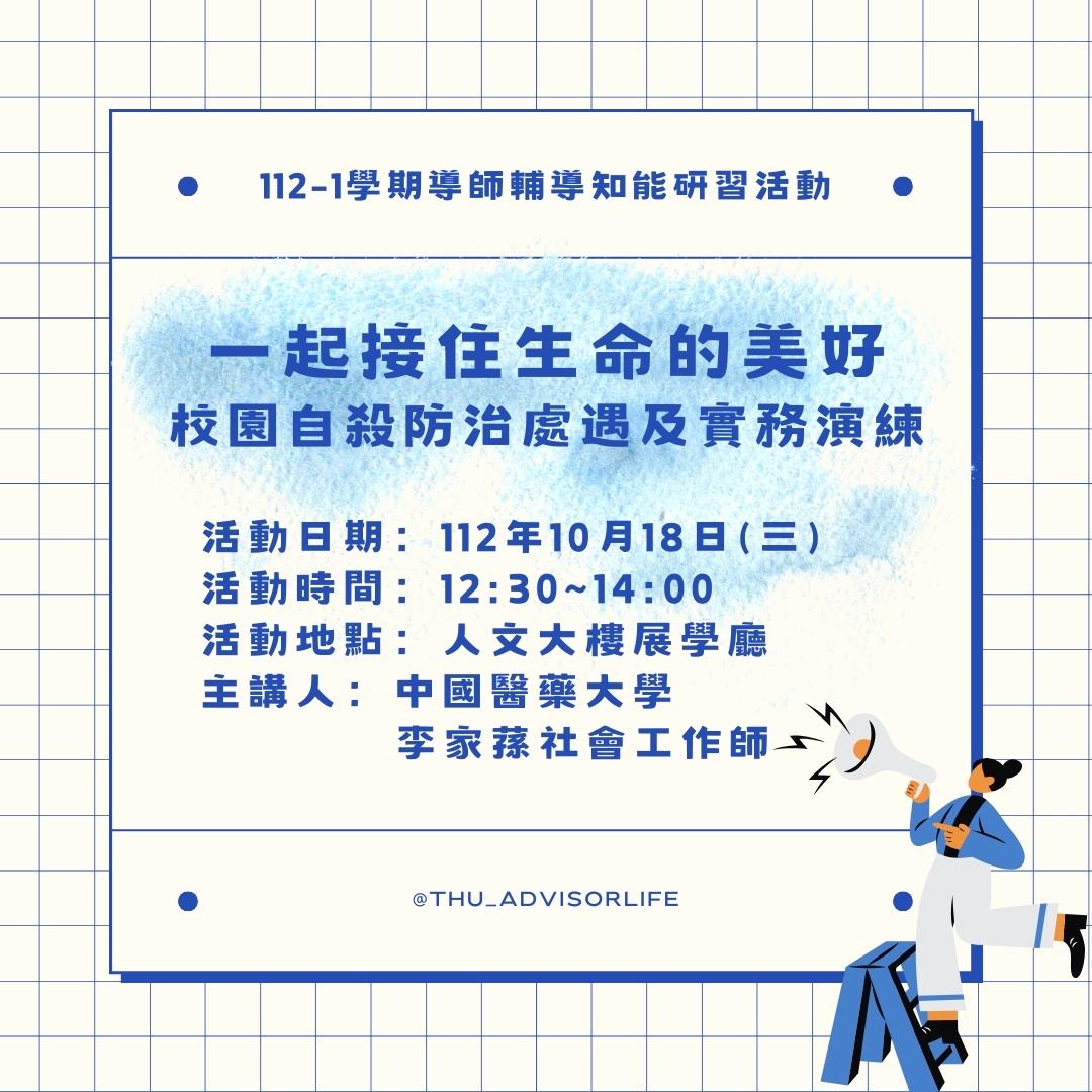 | 一起接住生命的美好:校園自殺防治處遇及實務演練 加入Google行事曆 | 人文大樓展學廳H321 | 2023-10-18 ~ 2023-10-18 | 12:30 ~ 14:00 | 2 | 42 | 47 |
