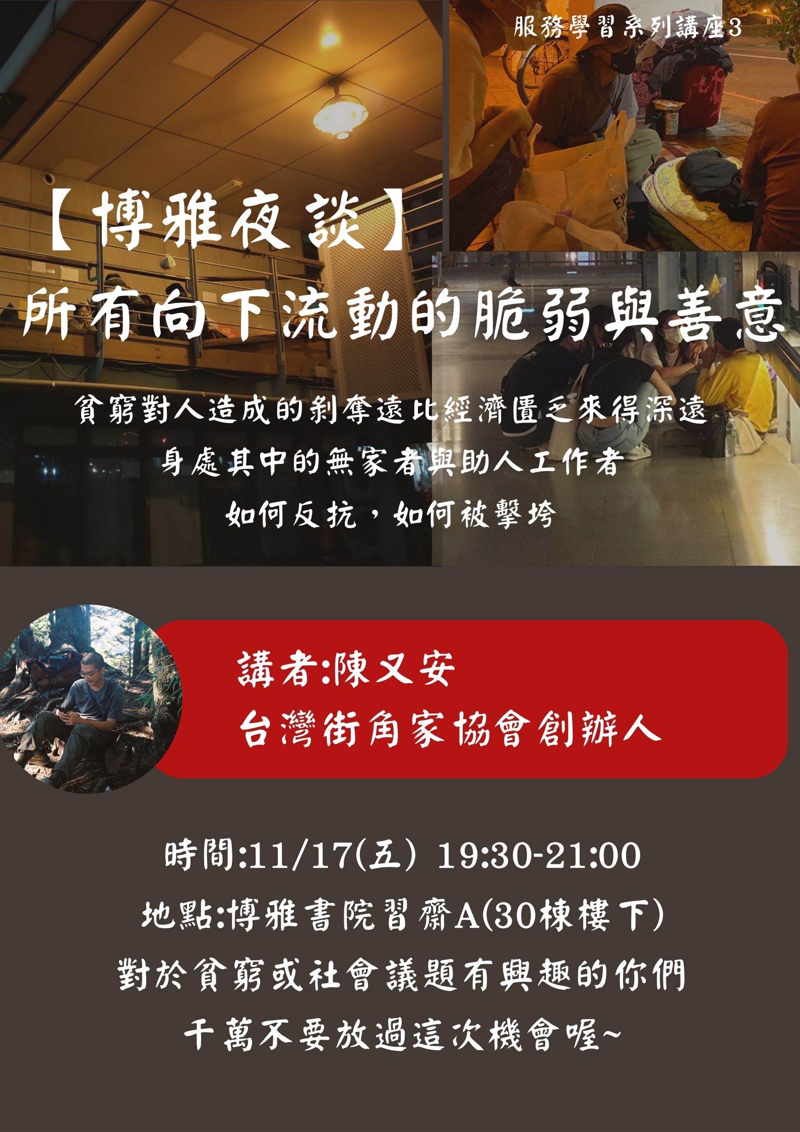 不知道大家是怎麼定義貧窮及弱勢族群的? 通常會用什麼角度去看待他們呢?透過直接的接觸交談,往往會提供我們多面的視角,去看見人更立體的樣貌。流落街頭也許是大部分的人這輩子不太會經歷到的過程,但身處大城市的我們卻又處處可見他們的身影,似乎我們隨時會身處於這樣的情況之中。多數的大眾對於無家者的印象常是負面的,例如好吃懶做、酗酒、暴力、骯髒,會有許多的標籤貼在他們身上,但是這些標籤的背後,究竟隱含著一些甚麼樣的事情。 透過實地助人工作者的視角,幫助大家更加了解,無家者的真實樣貌,以及關注議題的你我,該如何回應與行動。