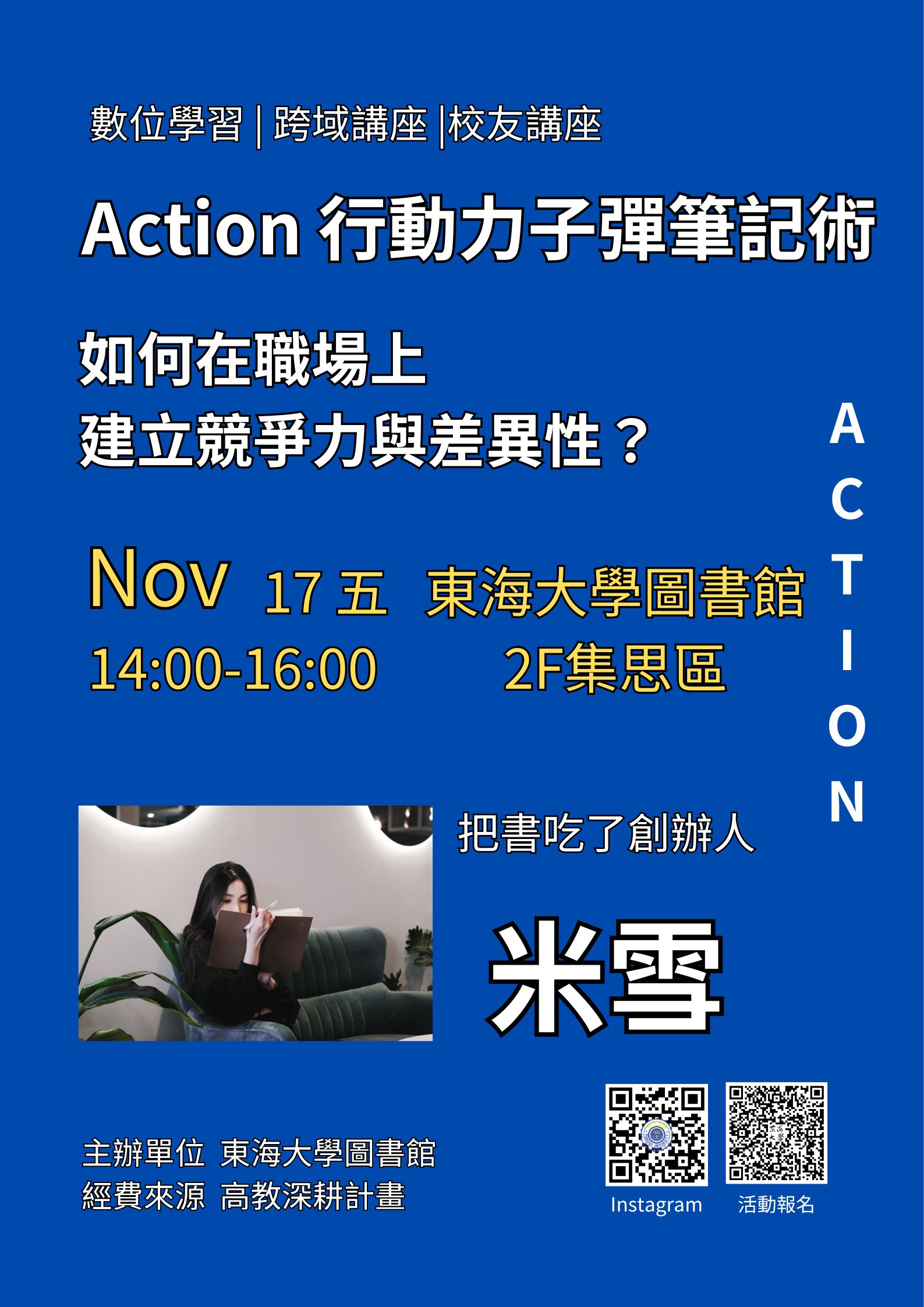 | Action 行動力子彈筆記術:如何在職場上建立競爭力與差異性? 加入Google行事曆 | 圖書館 2F集思區 | 2023-11-17 ~ 2023-11-17 | 14:00 ~ 16:00 | 2 | 50 | 51 |