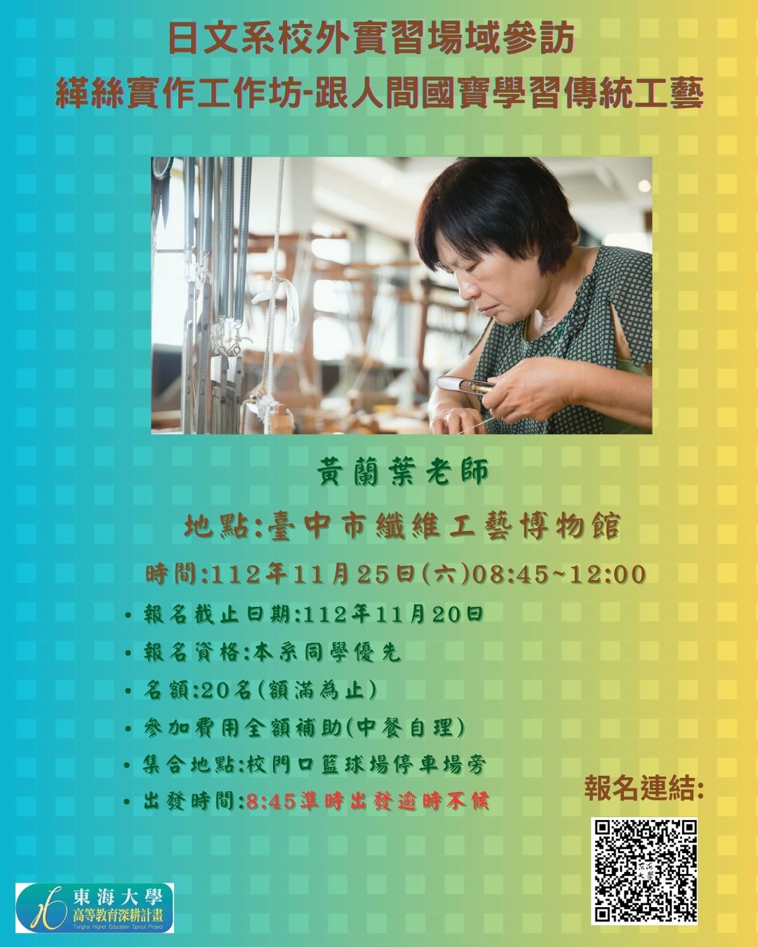 | 112學年日文系校外實習場域參訪 加入Google行事曆 | 台中市纖維工藝博物館 | 2023-11-25 ~ 2023-11-25 | 08:45 ~ 12:00 | 3.5 | 20 | 5 |