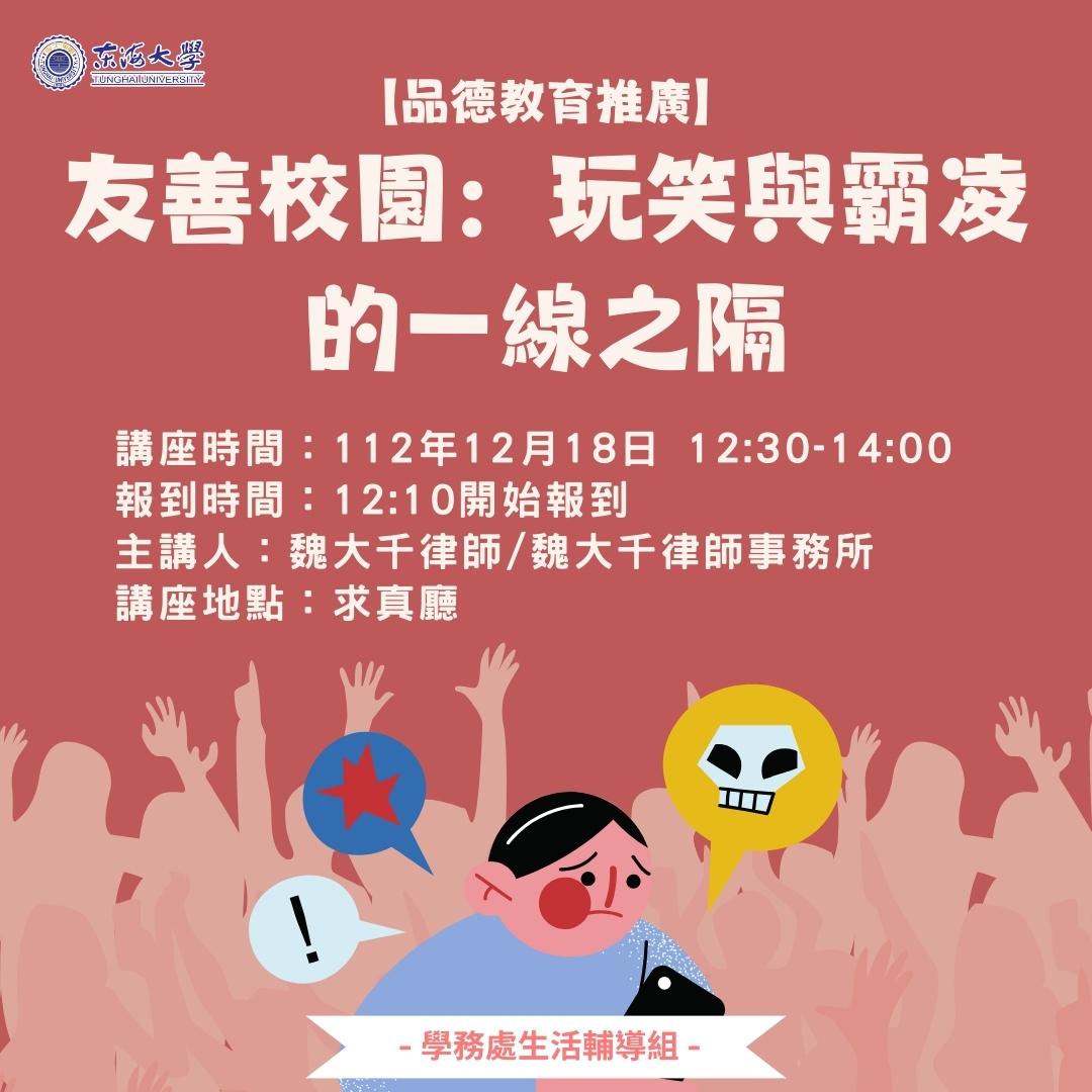 本講座邀請魏大千律師事務所魏大千律師帶領大家認識甚麼是霸凌,以及如何拿捏玩笑的界線,避免碰觸霸凌的紅線。