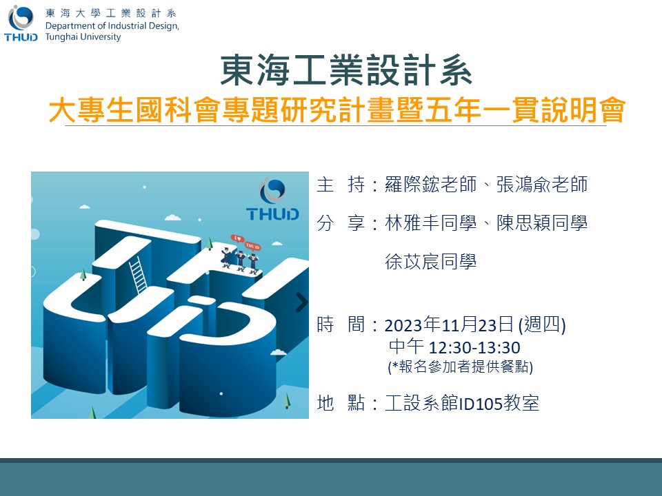 | 工設系112學年度大專生國科會專題研究計畫暨五年一貫說明會 加入Google行事曆 | 工設系ID105 | 2023-11-23 ~ 2023-11-23 | 12:30 ~ 13:30 | 1 | 50 | 6 |