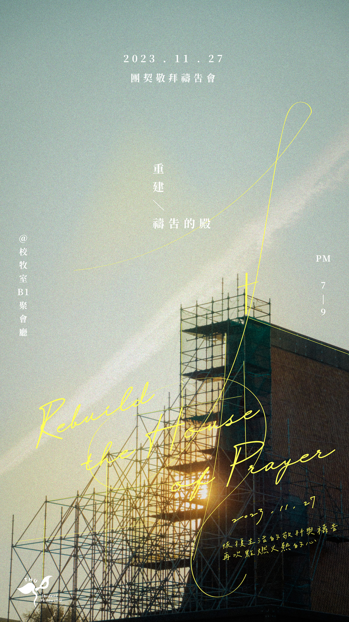 渴望藉著這次的禱告會,我們能一起用生命敬拜與禱告,重新把焦點對準神,再次點燃心中的火熱,再次在敬拜禱告中經歷到神的真實,並讓這個真實成為我們生命中的見證。