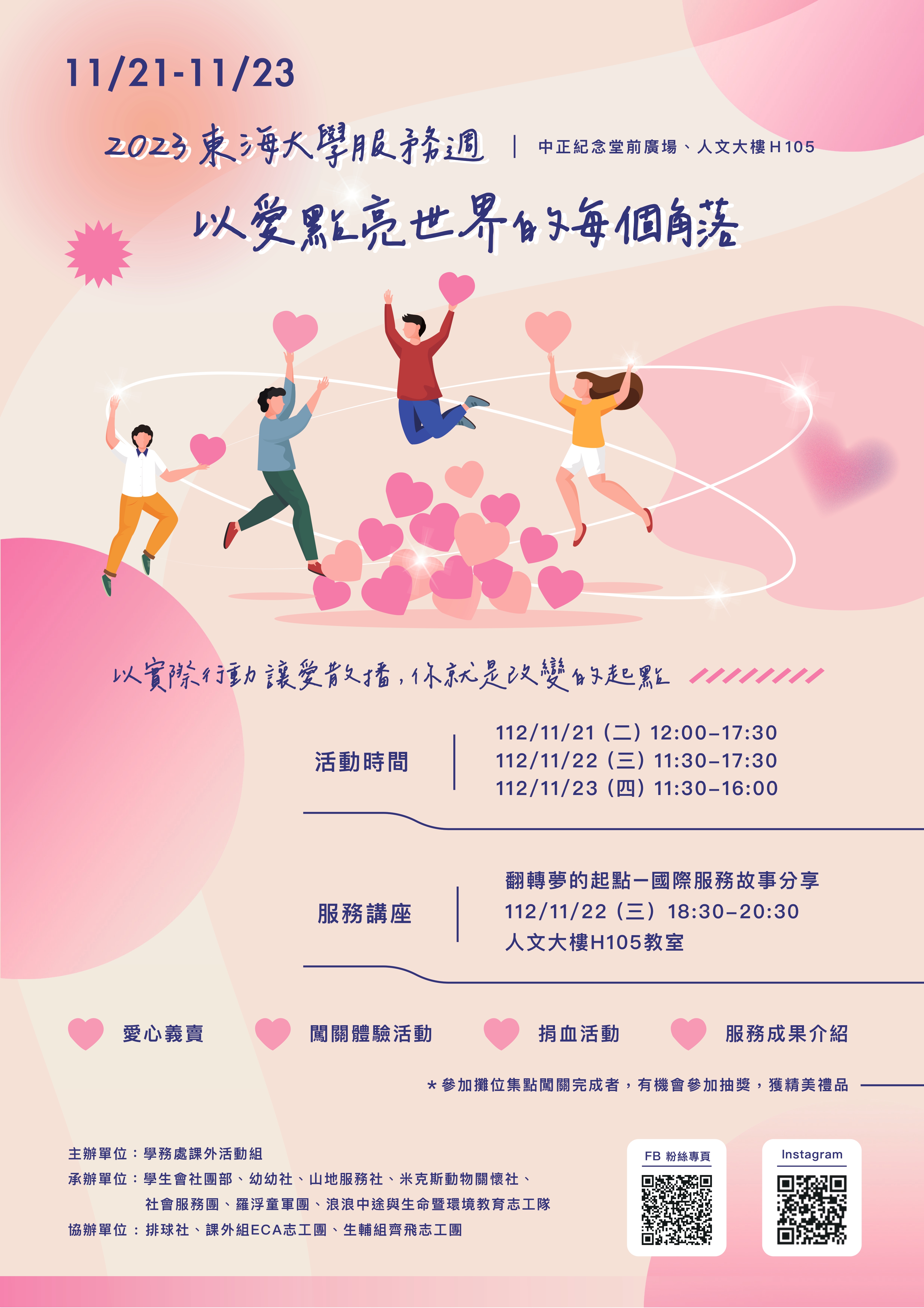| 2023東海大學服務週服務講座-國際服務故事分享 加入Google行事曆 | 人文大樓H105教室 | 2023-11-22 ~ 2023-11-22 | 18:30 ~ 20:30 | 2 | 40 | 28 |