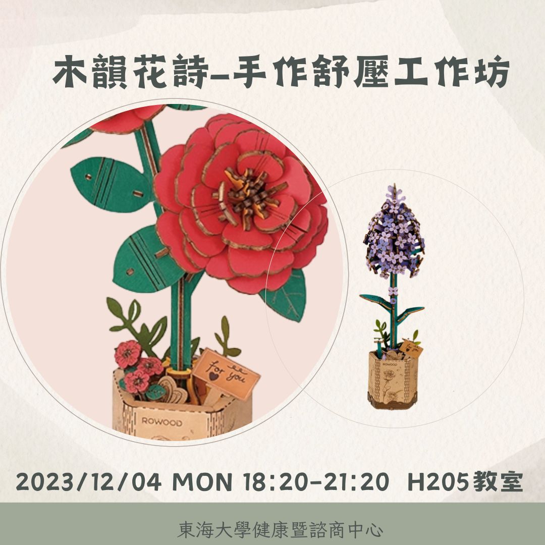 | 木韻花詩-手作舒壓工作坊 加入Google行事曆 | 人文大樓H205 | 2023-12-04 ~ 2023-12-04 | 18:20 ~ 21:20 | 3 | 26 | 26 |