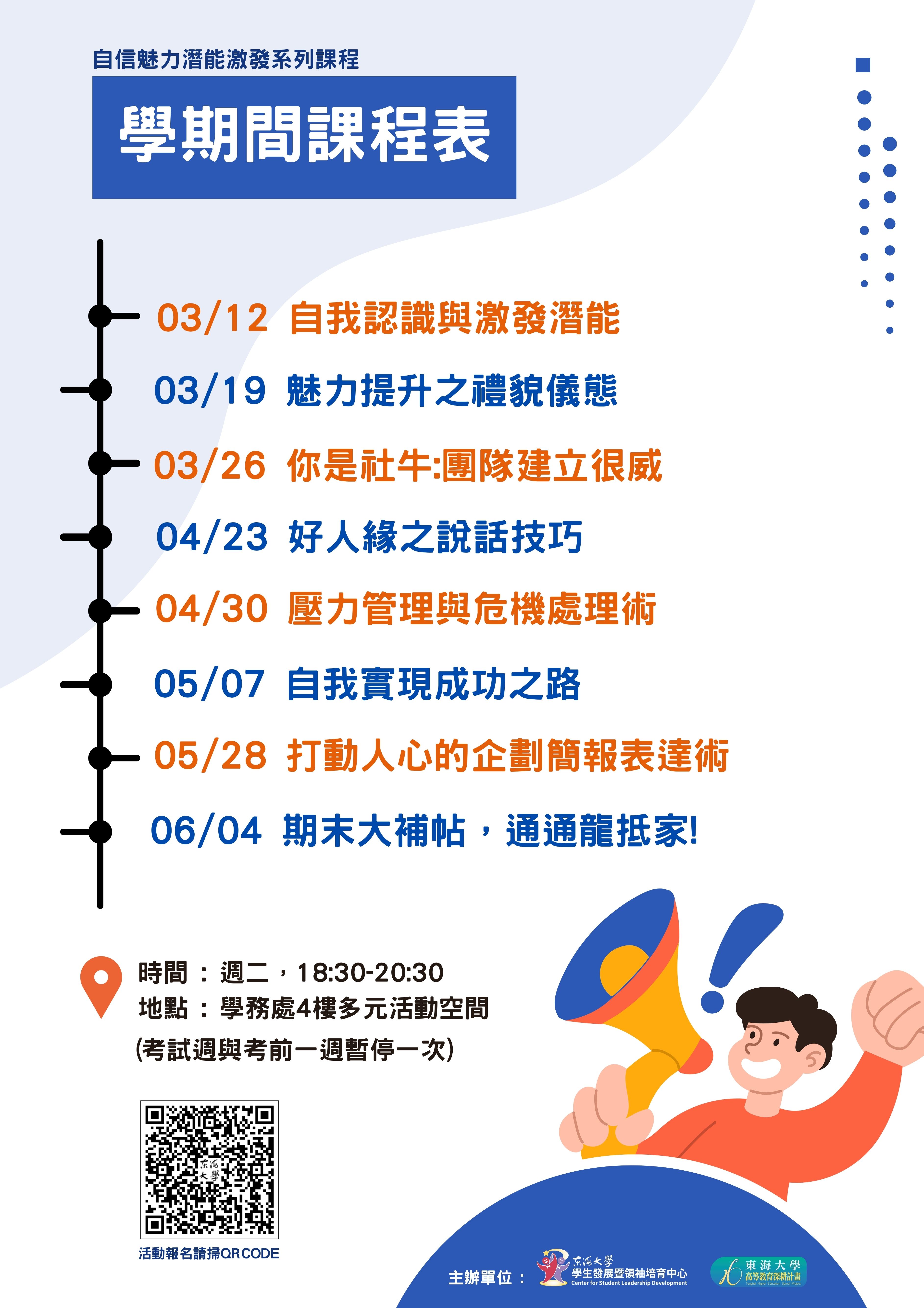 【活動大綱】多元培育-潛能激發系列課程旨在協助參與者逐步發現、釋放個人潛能,並在學術、人際與專業技能方面全面成長。這八堂精心設計的課程將引導參與者從自我認識出發,透過不同面向的主題,深入探索個人潛能的各個層面。