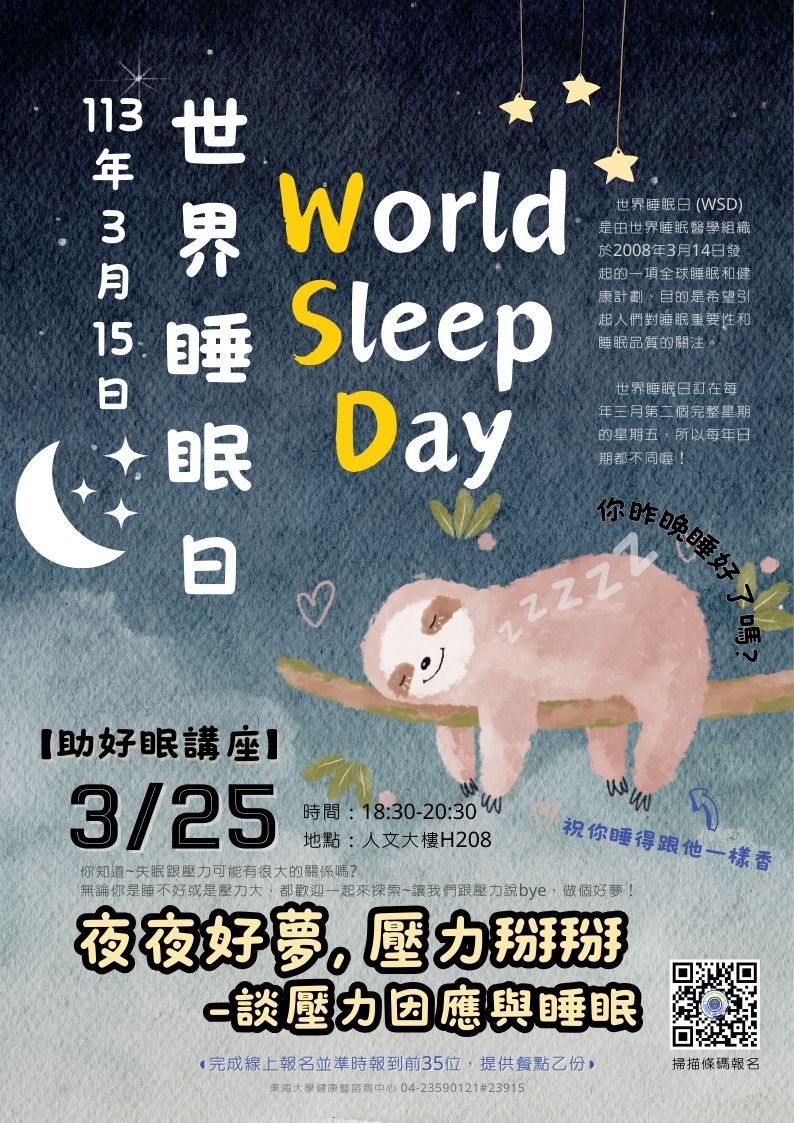 | 【助好眠講座】夜夜好夢,壓力掰掰 ─談壓力因應與睡眠 加入Google行事曆 | 人文大樓H208 | 2024-03-25 ~ 2024-03-25 | 18:30 ~ 20:30 | 2 | 50 | 54 |